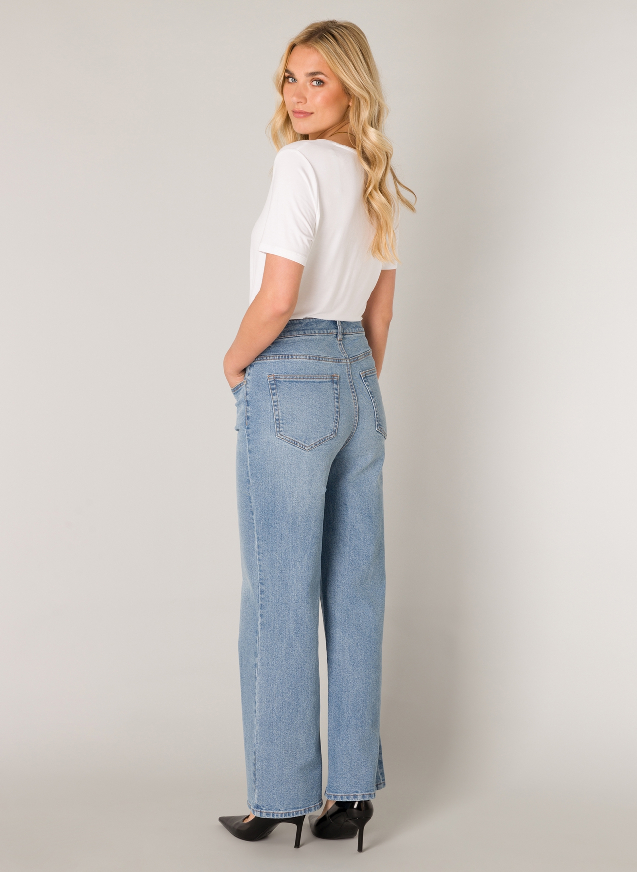 Amy is een jeans met een hoge taille en wijde pijpen. Gemaakt van een elastische katoenmix voor een fijne pasvorm. De broek heeft vijf zakken en sluit met een rits en knoop. Verkrijgbaar in lengte 32 inch. De perfecte broek voor een modieuze en comfortabele look!