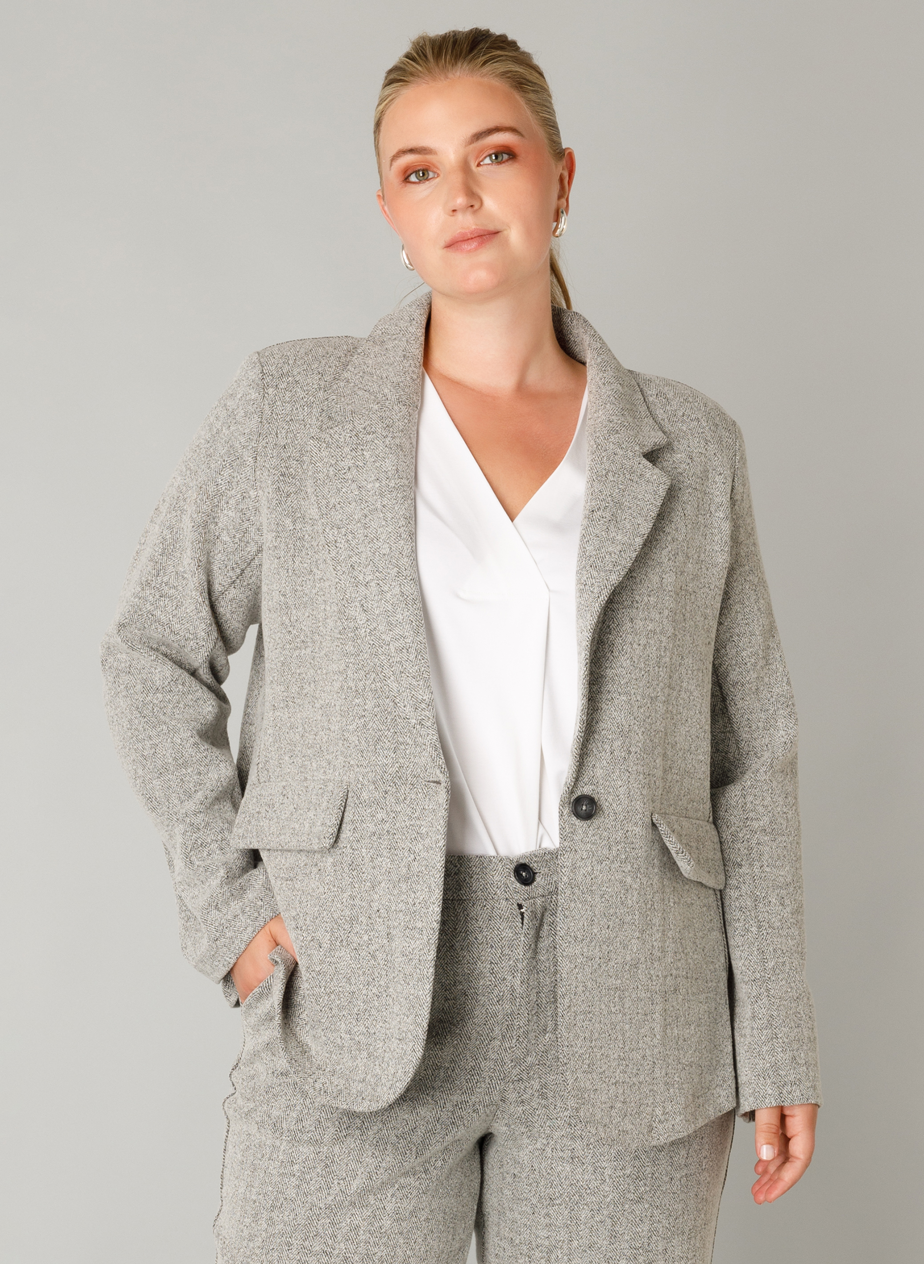 Kies voor een tijdloze en stijlvolle look met deze blazer van Yest Curve, speciaal ontworpen voor dames in grote maten. Het klassieke regular fit model is gemaakt van een comfortabele mix van polyester, katoen en elastaan en afgewerkt met een subtiel visgraat breisel.