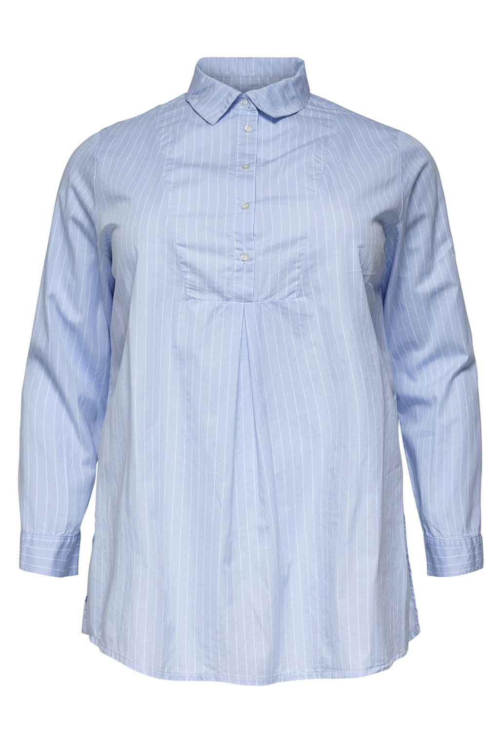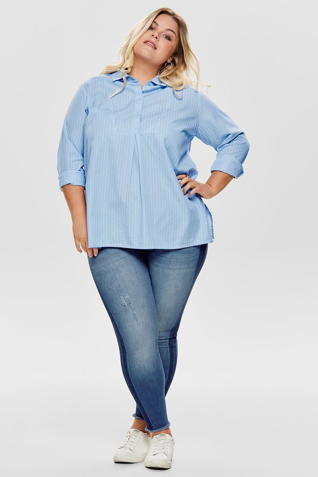 The classic fenimin look krijg je met deze trendy blouse van Only Carmakoma. De blouse heeft een fijn streepje en een klein kraagje met een kort knooppad. Hieronder zit een brede plooi, die ruimte geeft over de buste.