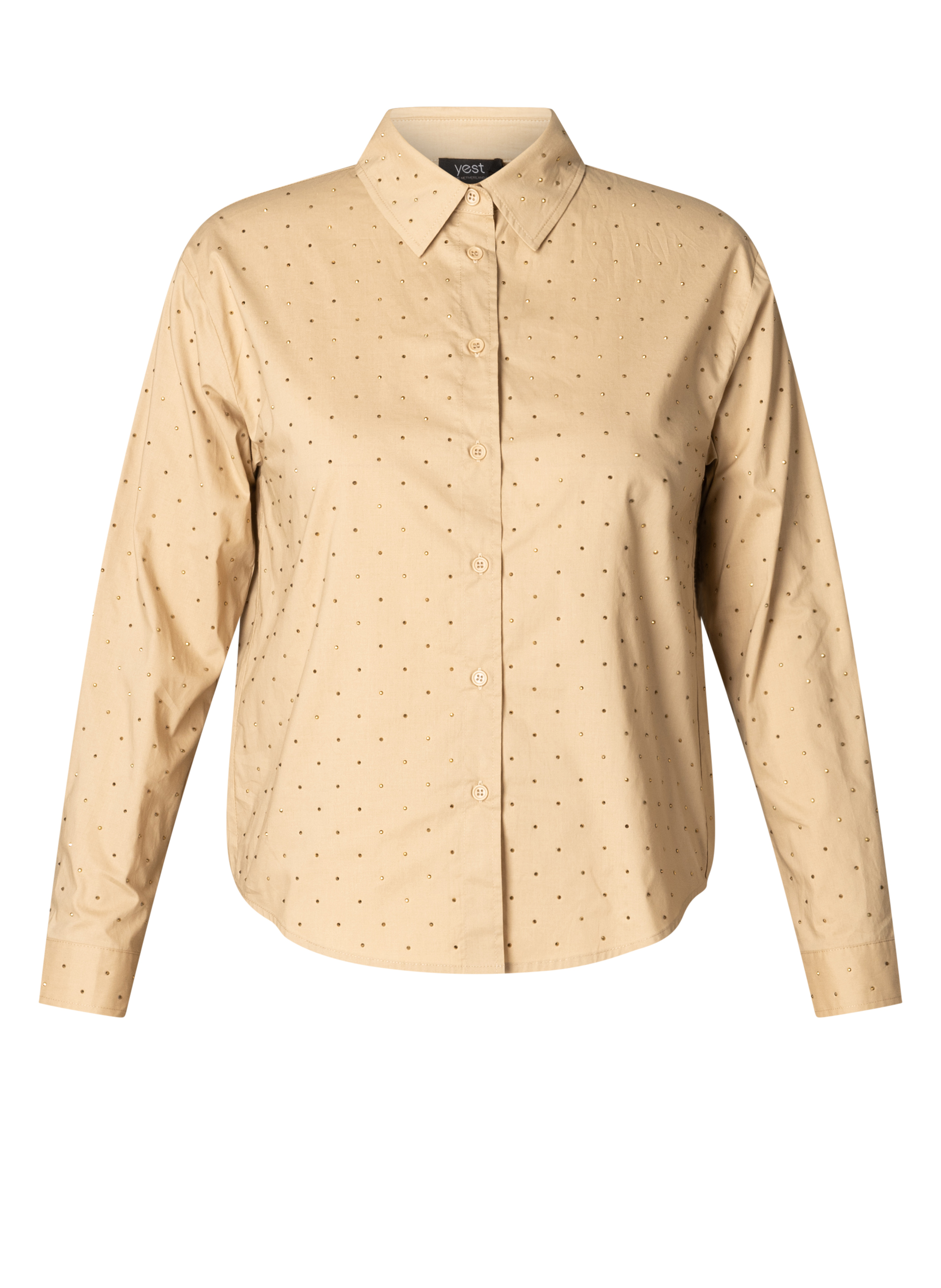 De Frances blouse van Yest Curve voegt een subtiele sparkle toe aan je outfit. De allover strass steentjes zorgen voor een vleugje glamour, terwijl de katoenen stof zacht, ademend en comfortabel aanvoelt.