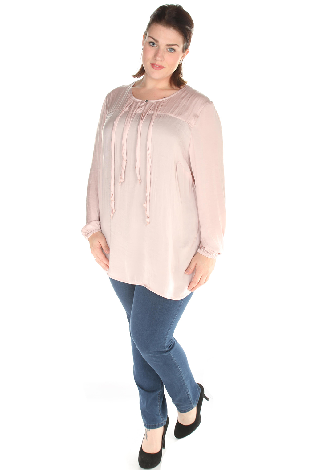 Wat een lief blousje van Maxima fashion, gemaakt in een zachte roze satijn stof. Onder de ronde hals hangen een aantal slierten, deze zijn alleen gelockt en draaien daardoor een beetje. In de hals lijn zit ook nog een splitje met knoopje en lusje. In de mouwen zit een elastiekje en de panden zijn afgerond. Kayleigh draagt de blouse op een jeans uit de Stark collectie.