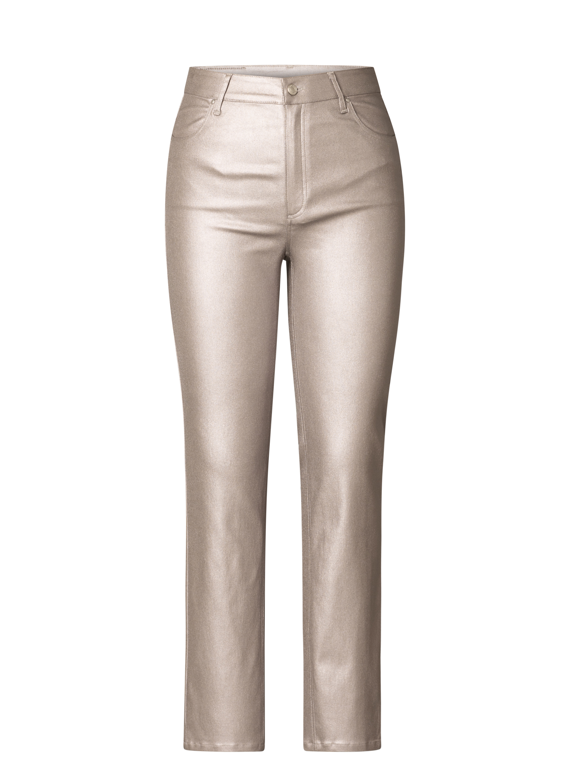 Vervaardigd uit een elastische viscosemix met coatingafwerking, geeft de Oelkje-broek een glad en licht glanzend oppervlak dat zorgt voor een strakke, verzorgde look. De broek is voorzien van een klassieke vijfzakkenconstructie, riemlussen en een sluiting met rits en knoop, wat het model geschikt maakt voor zowel formele als trendy gelegenheden.