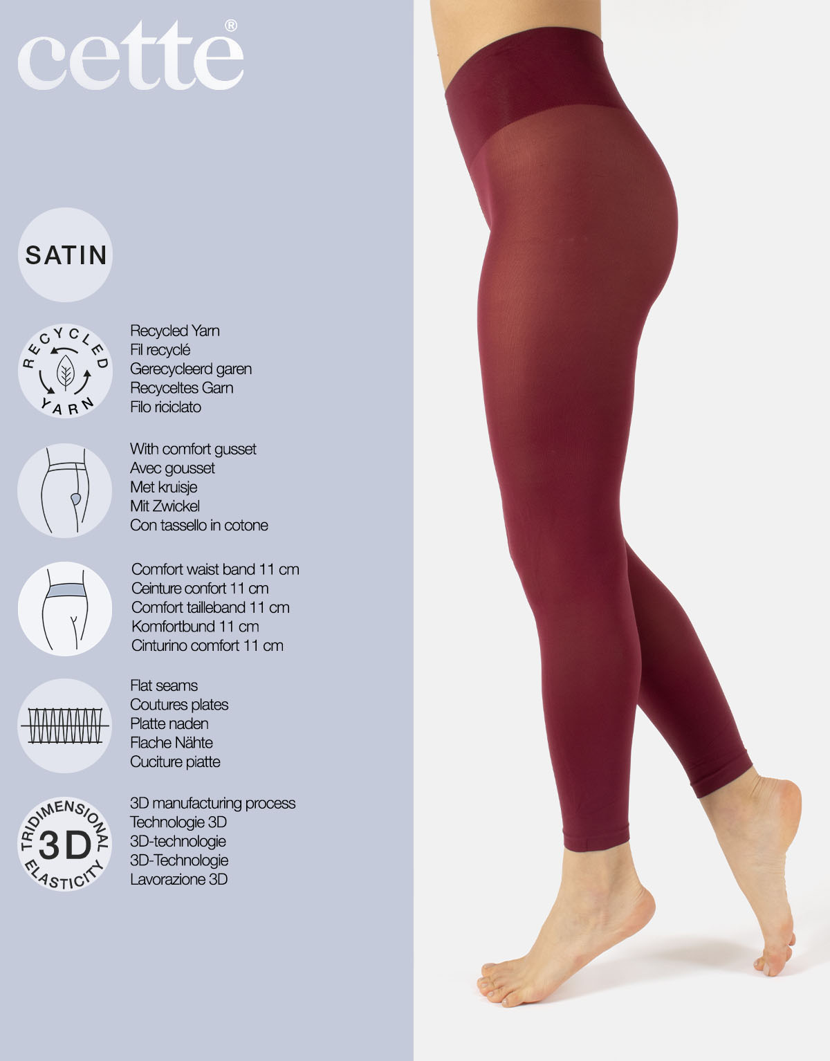Doorlopende, opaque eco-panty van Cette zonder voet, multivezel, katoenen kruisje, platte naden. Zeer rekbare broek, zonder rugstuk.