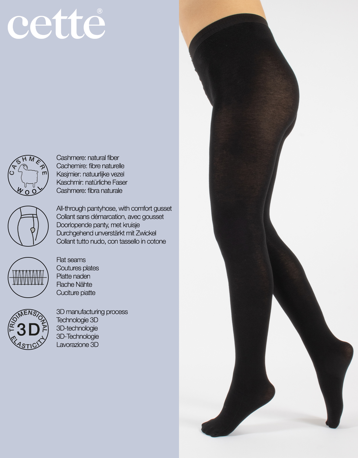 150 denier opaque winterpanty in kasjmier en viscose. Uitzonderlijk zacht, elastisch en stevig dankzij de 3D technologie. Deze warme en comfortabele Cette panty zorgt voor een stijlvolle winterlook. Met platte naden.