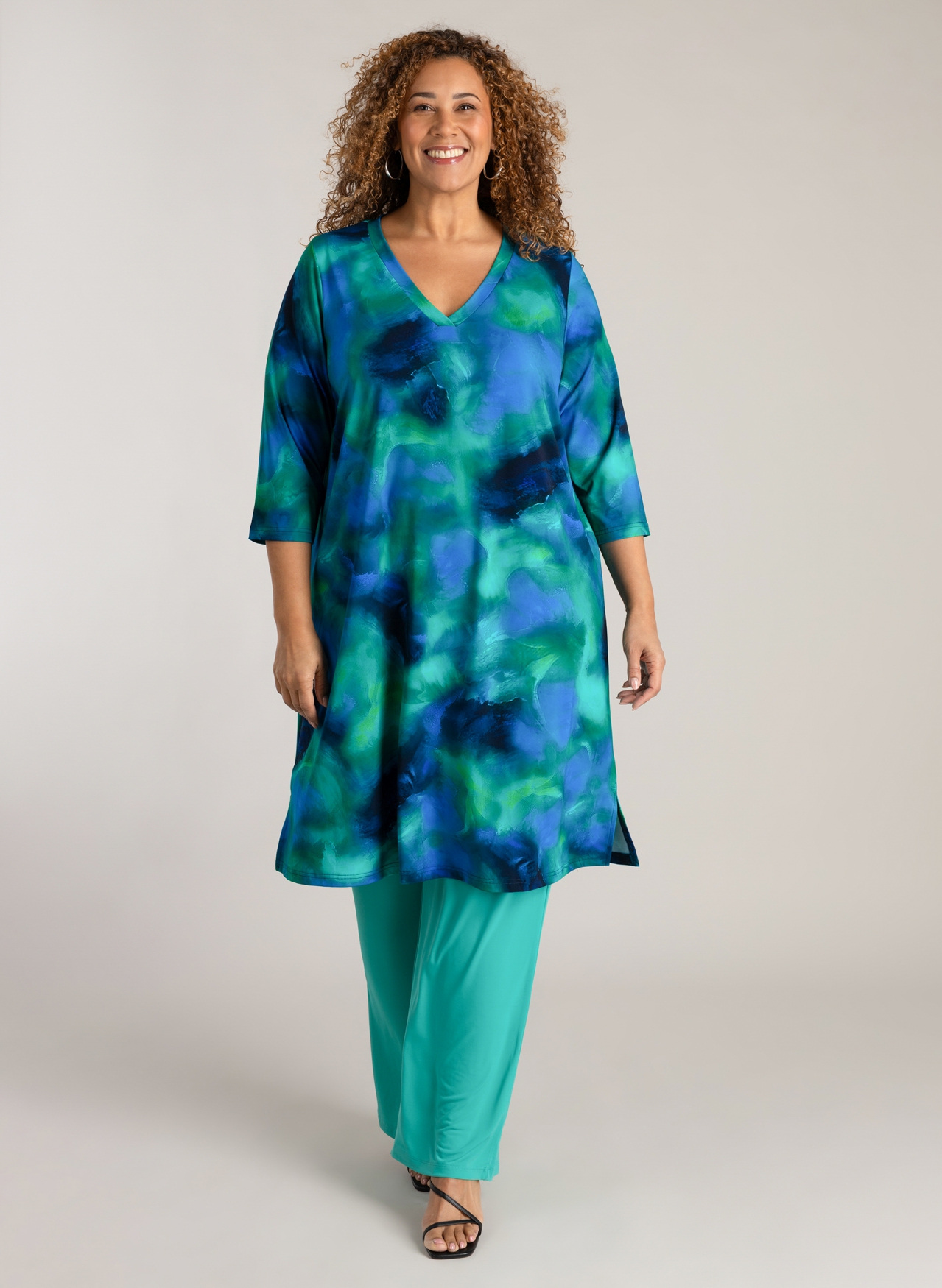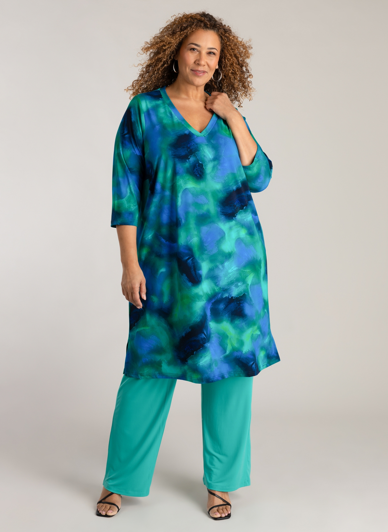 Met haar levendige aquakleur is de Nienke jurk een echte opfrisser in je garderobe. De gladde stof voelt licht aan en valt soepel langs het lichaam. De regular fit maakt haar prettig om te dragen, zowel gecombineerd met een broek als solo met blote benen op warmere dagen. Lengte 105 cm.