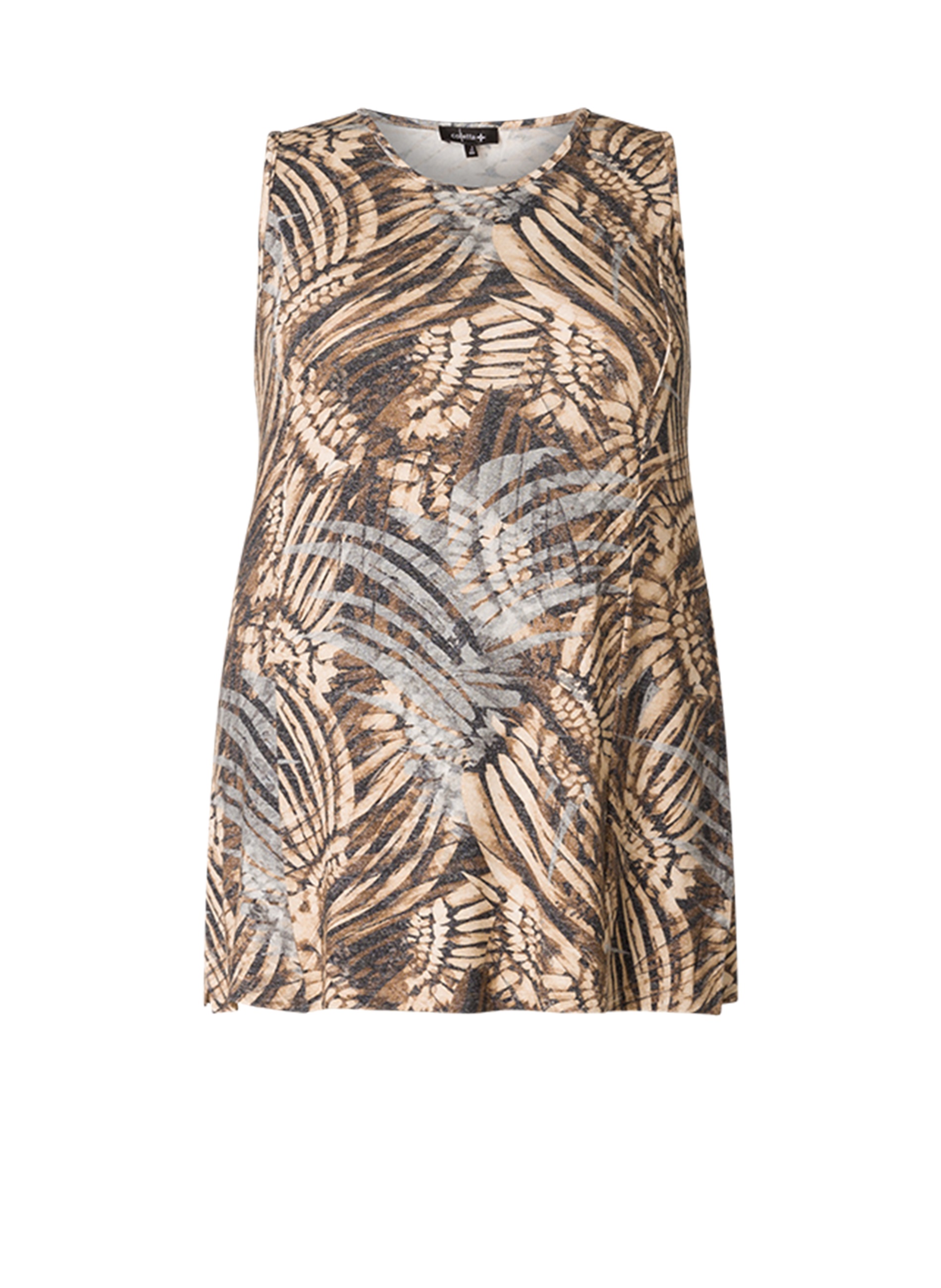 Colletta singlet is gemaakt in een mooi fijn breisel die zacht aanvoelt. Hij heeft een ronde hals en een Alijn pasvorm. Er is een bijpassend vest 9000217 en een tuniek in dezelfde print 9000218.