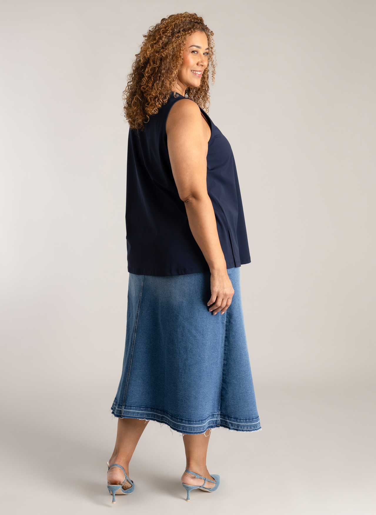 De Nona is een mouwloze A-lijn top met een flatterende V-hals en subtiele splitjes in de zijnaad. Gemaakt van comfortabele travelstof die soepel valt, vormvast is en nauwelijks kreukt. Verkrijgbaar in off white en navy, perfect als basis onder een blazer of vest. Lengte 74 cm.