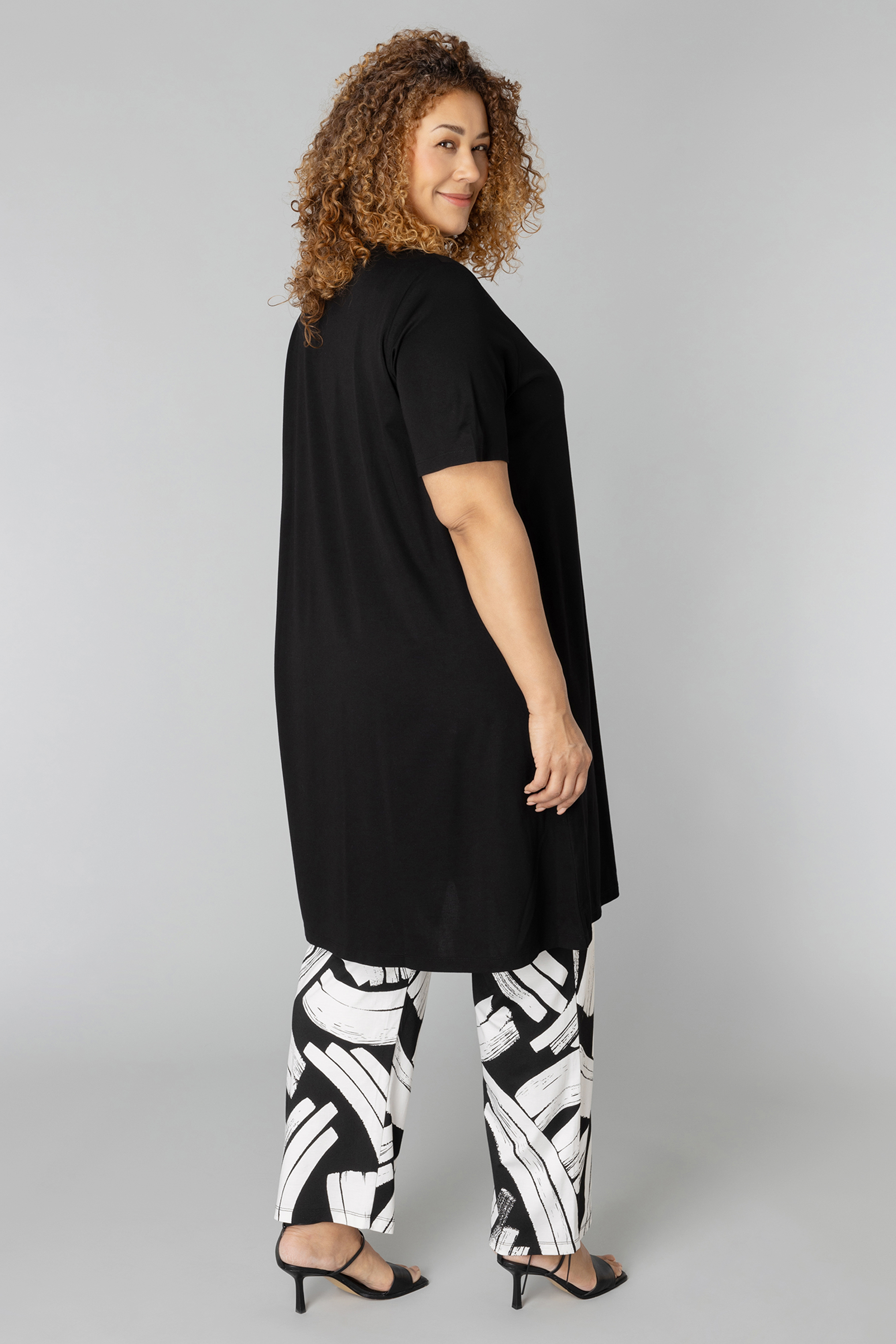 Deze A-lijn tuniek van Colletta in diepzwart is de perfecte balans tussen comfort en stijl. De v-hals en korte mouwen maken het een ideale keuze voor warme dagen. Het veelzijdige ontwerp maakt deze tuniek perfect om te combineren met verschillende accessoires en schoenen. Op de foto is hij gecombineerd met de print broek 9000530.