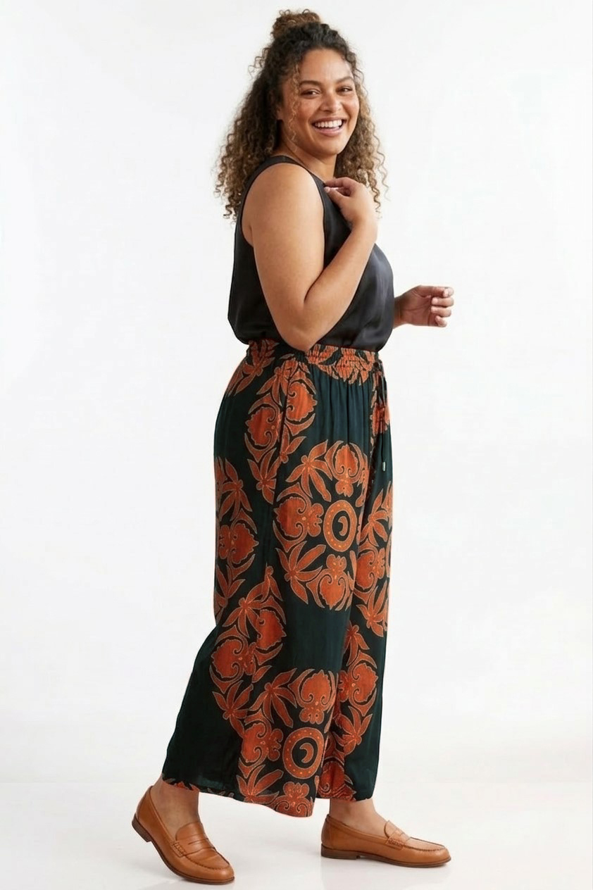 Deze wijde broek van Curviss is een comfortabele en stijlvolle keuze voor elke dag. De broek is uitgevoerd in zwart met een roestkleurige print, wat zorgt voor een warme en modieuze uitstraling.