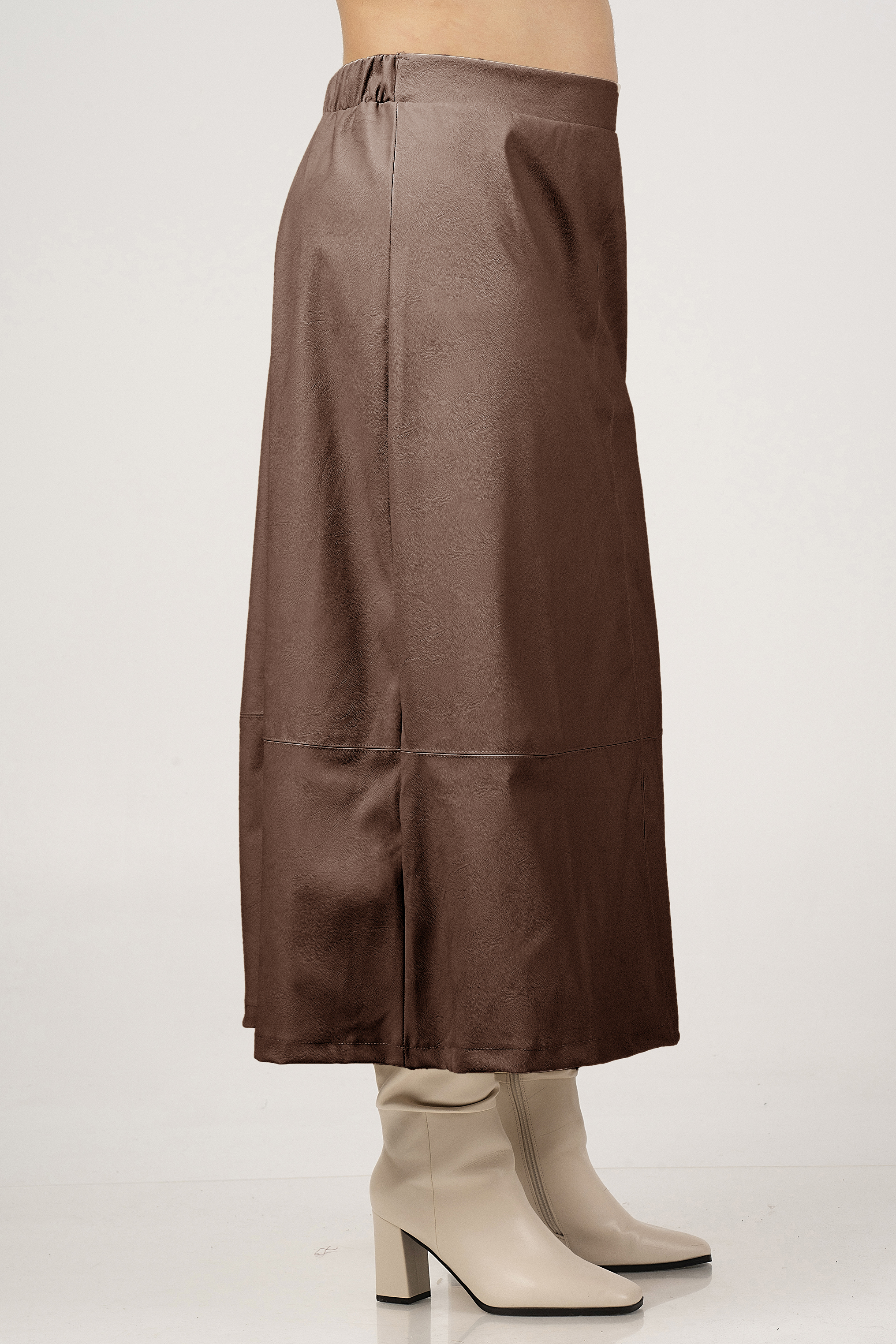 Curviss rok leatherlook is een uitlopend model. Hij heeft voor een gladde tailleband en achter zit elastiek. In de panden zitten deelnaden verwerkt. De rok valt halverwege de kuiten.