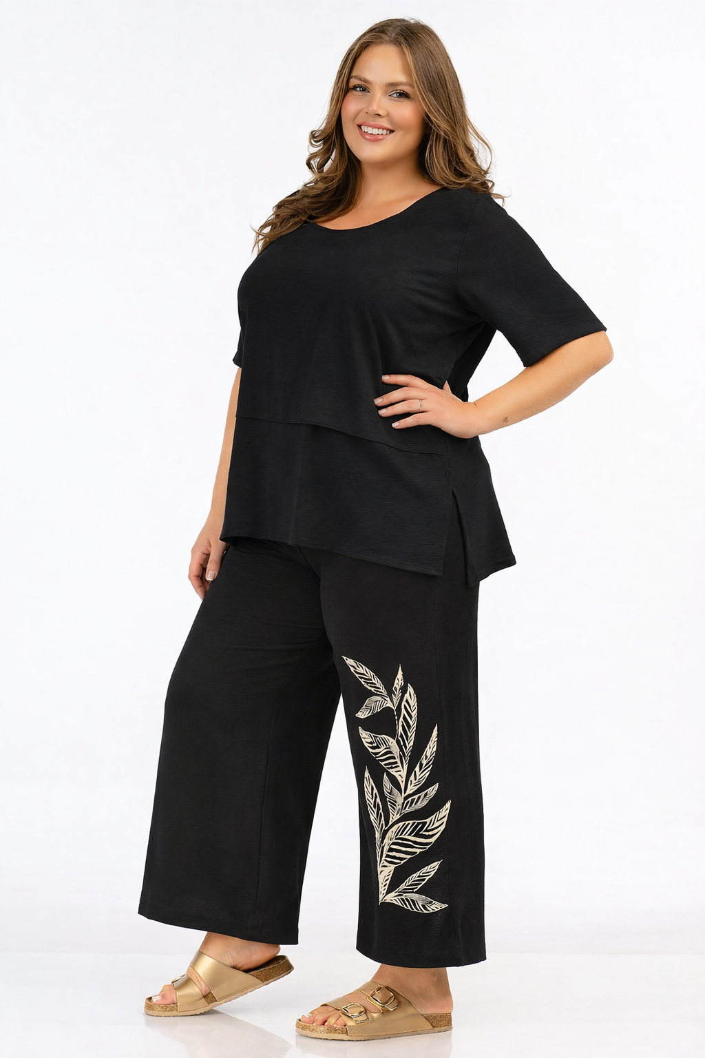 Deze stijlvolle set van Curviss bestaat uit een top en een bijpassende broek en is perfect voor een complete, moeiteloze outfit. De top heeft een fijne pasvorm en is prettig om te dragen,Hij heeft een ronde hsls en korte mouwen. Op het voorpand zit een extra overslag. De broek is eenrondom elastiek model met zakken, hij heeft wijder vallende broekspijpen. Aan de onderkant zit een leuke opdruk in een contrast kleur. Samen vormen ze een moderne set die ideaal is voor verschillende gelegenheden.