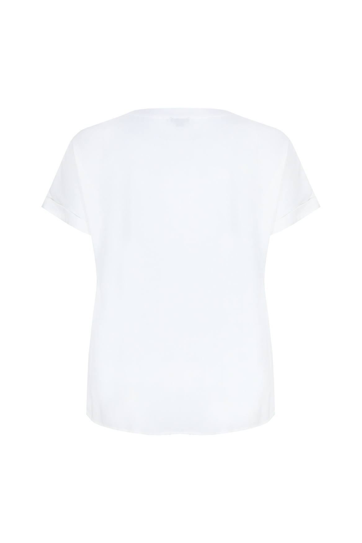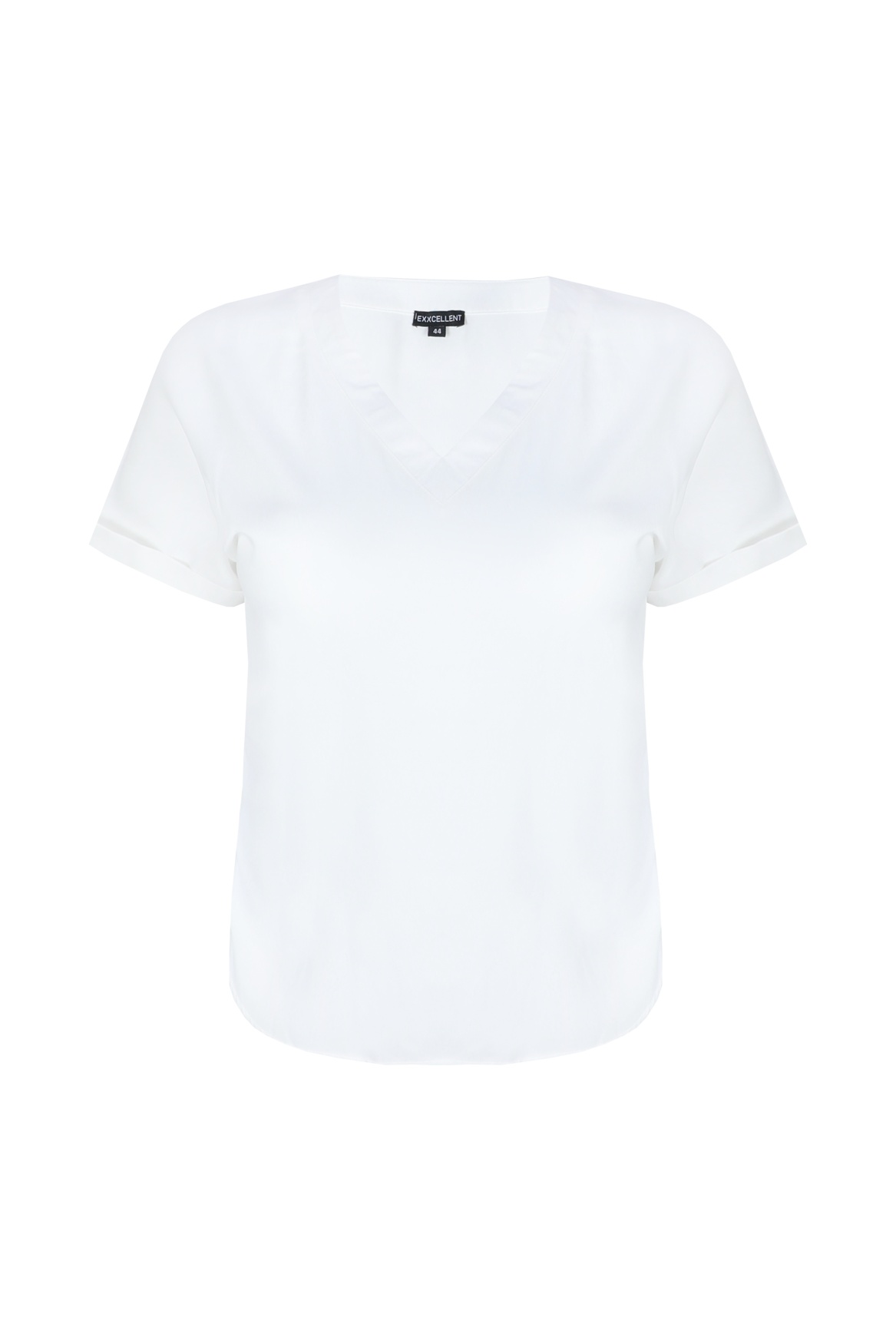 Mooie blouse van Exxcellent is gemaakt in een satijnstof met een zachte touch. Het model heeft een V hals en korte aangeknipte mouwtjes met een omslag. Het is een recht en iets oversized model. Deze blouse combineer je met een mooie broek of stoer bij een jeans.