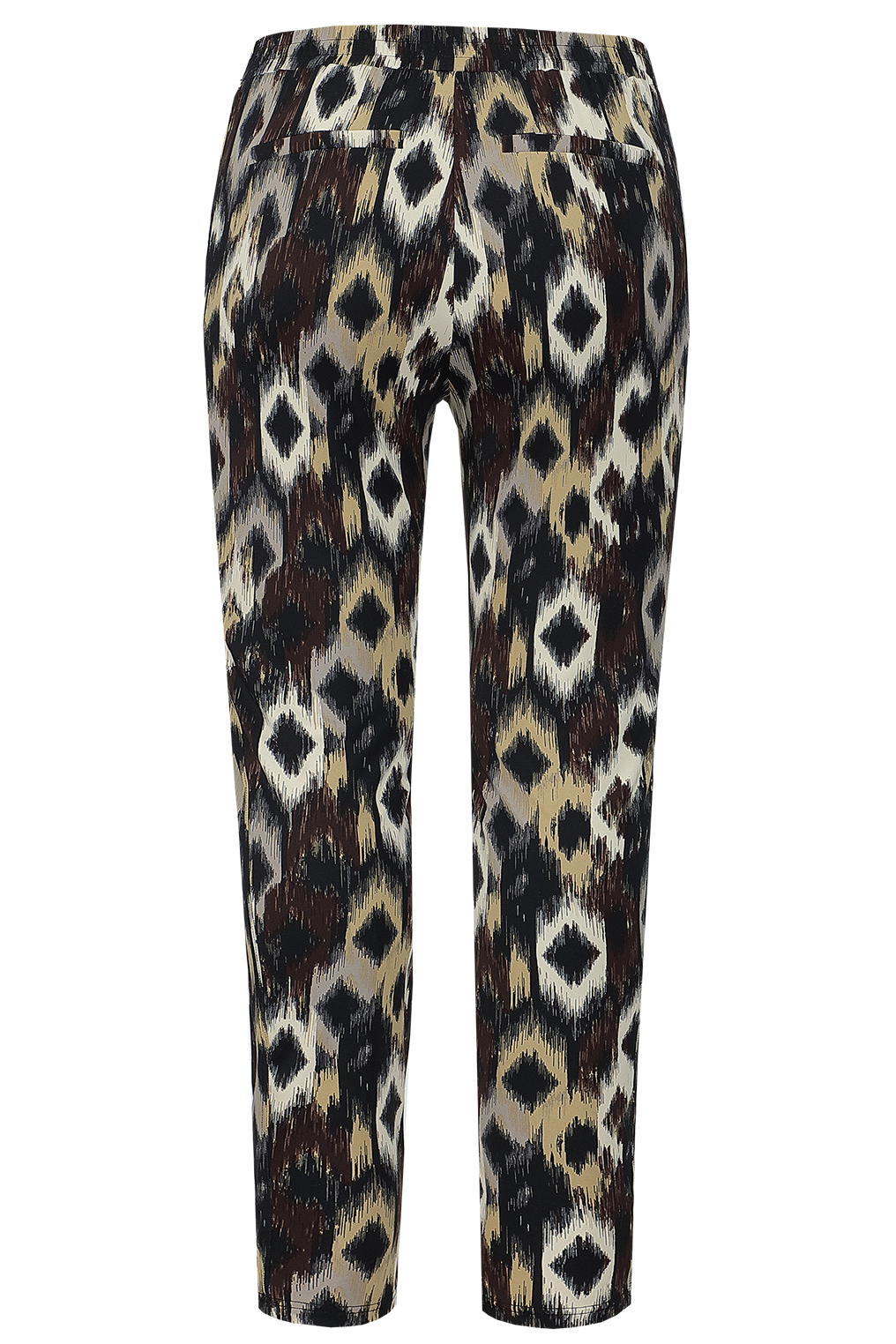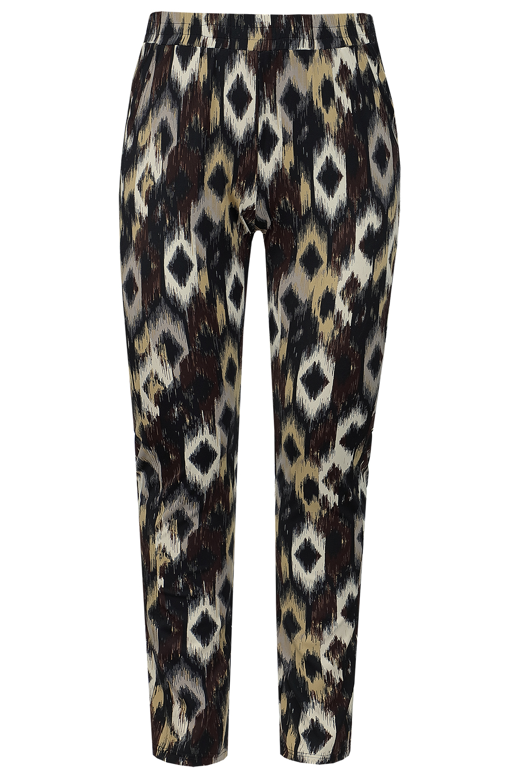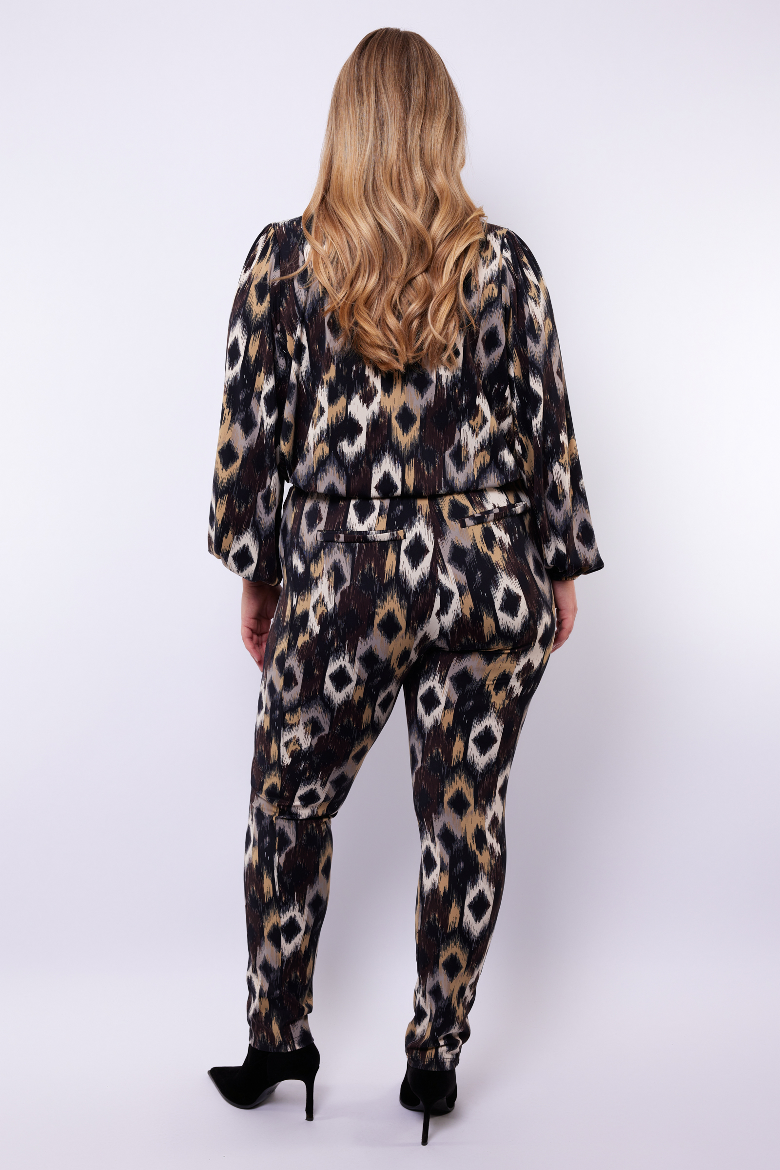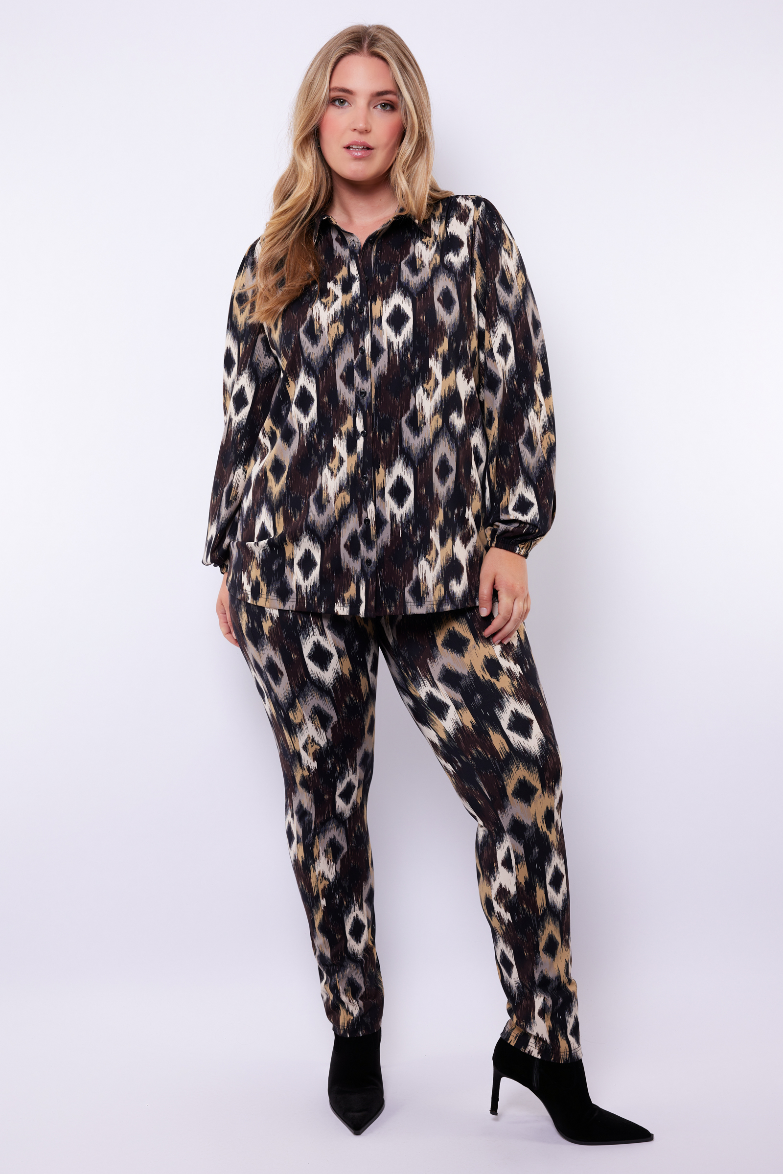 De Exxcellent Broek Tonya is een lange broek met een elastische tailleband voor een comfortabele en flexibele pasvorm. Het model heeft een rechte snit met een licht uitlopende pijp, wat zorgt voor een eigentijdse uitstraling. De broek is uitgevoerd in een opvallend, abstract patroon in verschillende kleuren, waaronder zwart, beige en grijs, voor een gedurfde, maar toch subtiele look.