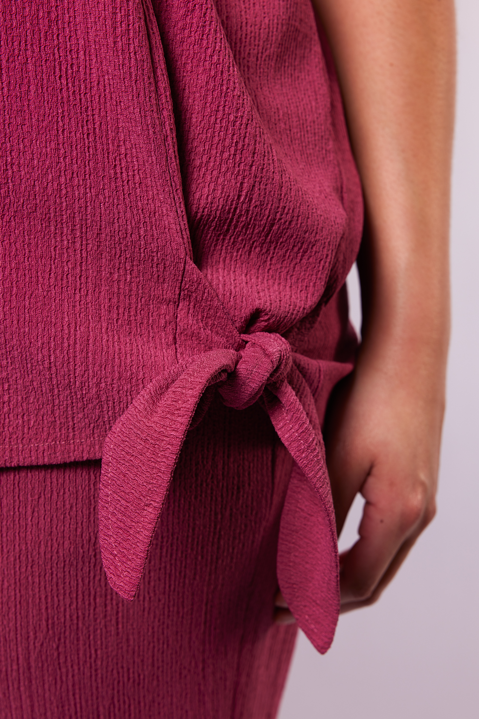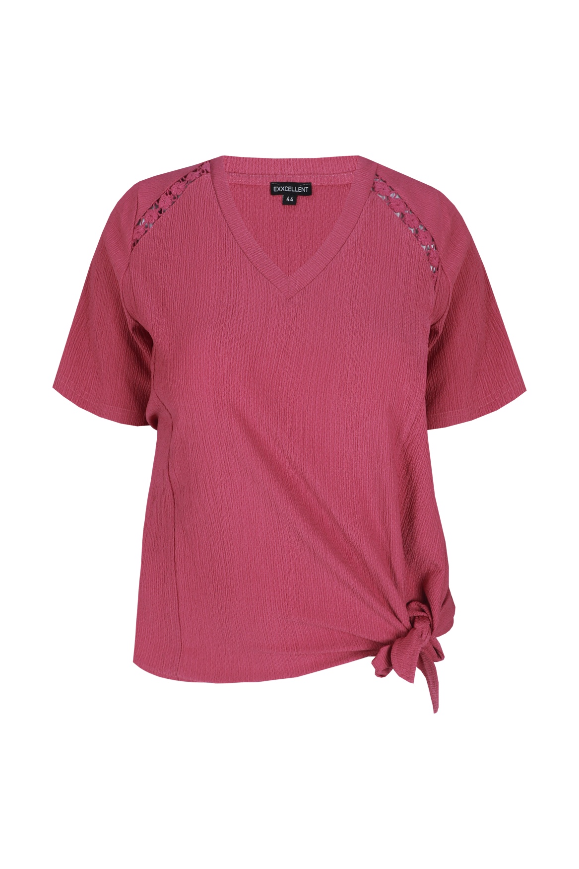 Mooi shirt van Exxcellent model Jaya. Hij is gemaakt in een zeer comfortabele ribbel jersey, met veel rek. Dit model heeft een V hals en korte mouwen. Onderaan de linkerkant zit een strik, deze kun je naar believen aantrekken. Er is een bijpassende broek model 26ZZE11. Een mooie set.