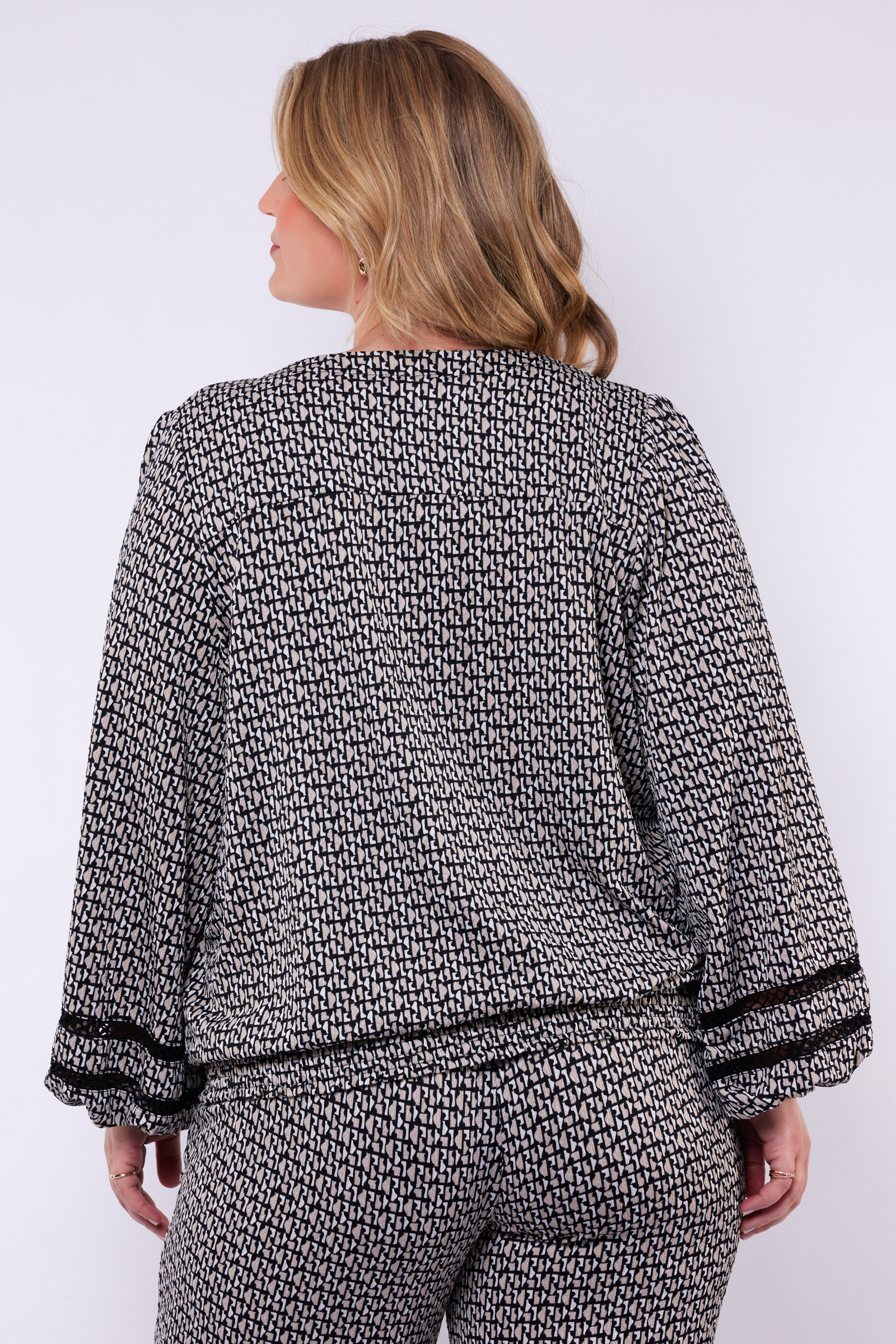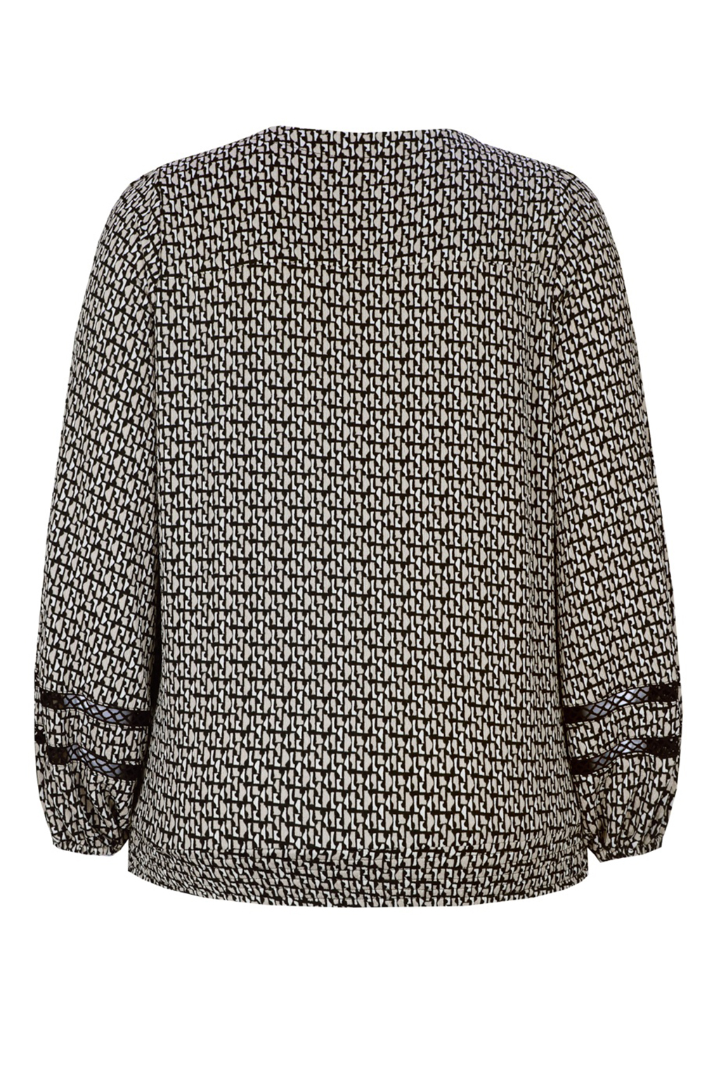 De Samara top is uitgevoerd in een fijne all-over print en afgewerkt met elegante open details op de mouwen. De V-hals en lange mouwen geven de top een vrouwelijke uitstraling, terwijl de elastische zoom zorgt voor een comfortabele en flatterende fit. Een veelzijdig item dat je moeiteloos draagt, van casual tot gekleed.