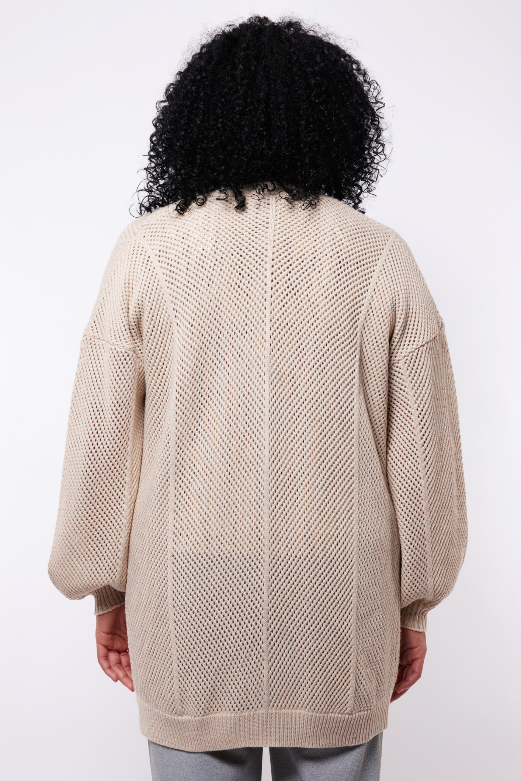 Exxcellent vest Annik is een opengewerkt breisel. Het is een losvallend model vest, zonder zakken of ceintuur. Middenvoor en bij de zoom zit een dichter gebreide rand, zo blijft het vest mooi in model. De mouwen vallen lang en heeft een pof effect. Bekijk nog meer mooie Exxcellent artikelen. het model draagt hieronder het shirt 24NZE07 en de broek 24NZE06.