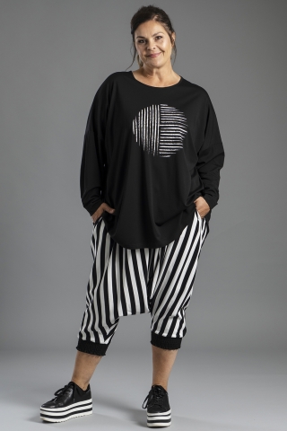 Gozzip broek Malin is een harembroek model in een brede wit zwarte streep. Hij heeft een elastische tailleband in zwarte tricot. In de zijnaad zitten steekzakken. Hij is gemaakt in een iets dikkere heavy jersey die super fijn aanvoelt. Hij heeft een zijbeen lengte van 86cm. Op de foto zie je onder andere de tuniek G232214. Er zijn nog meer leuke combinaties mogelijk met deze broek.
