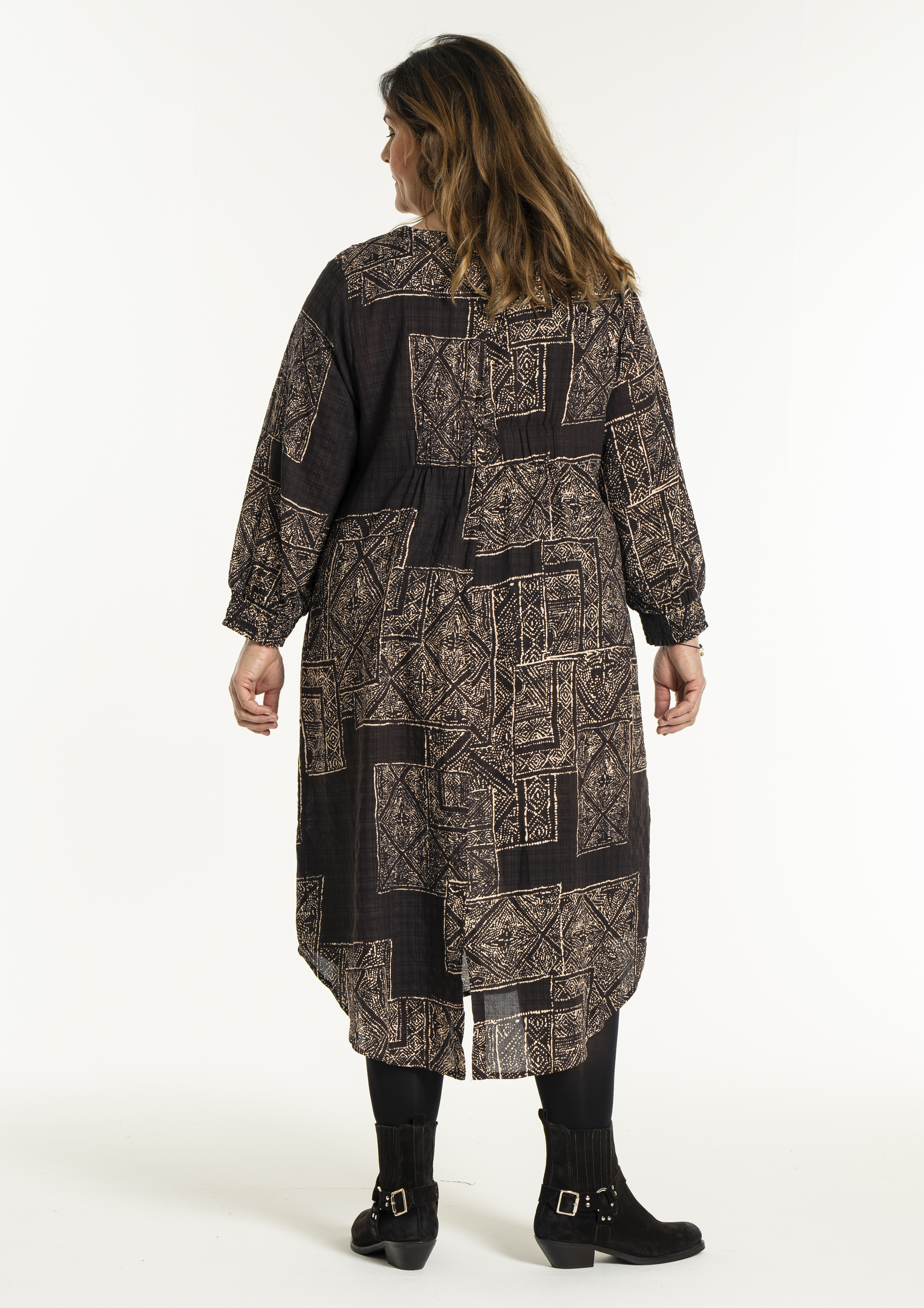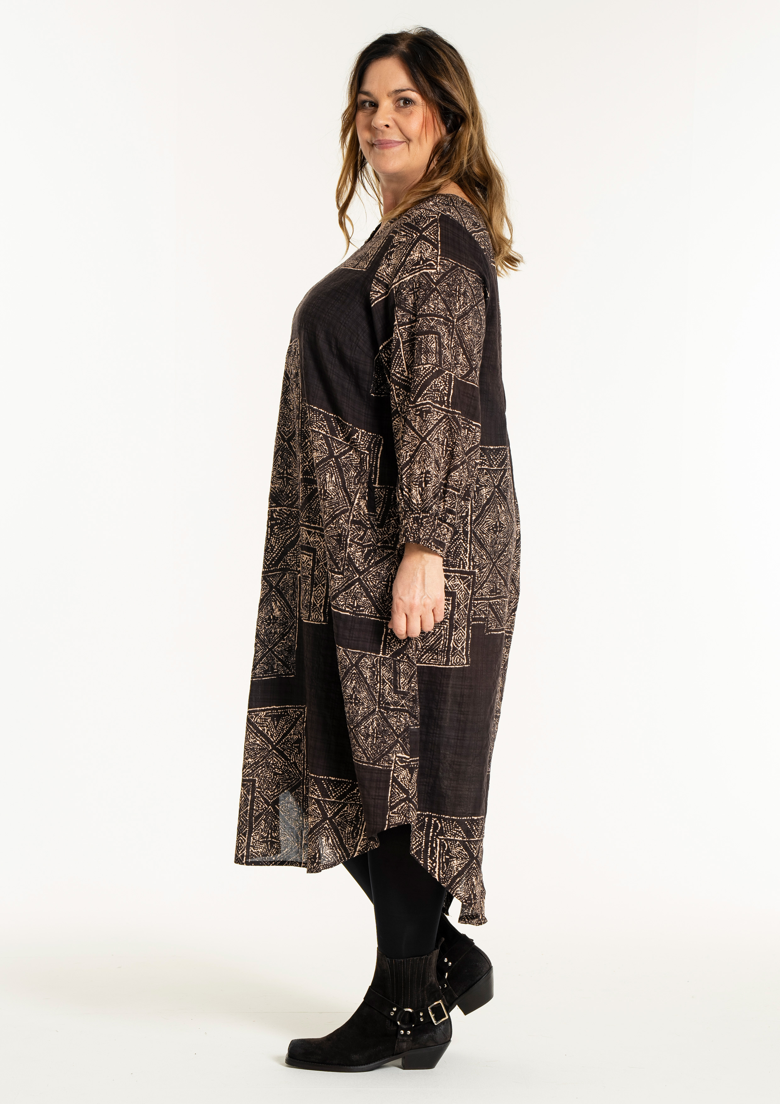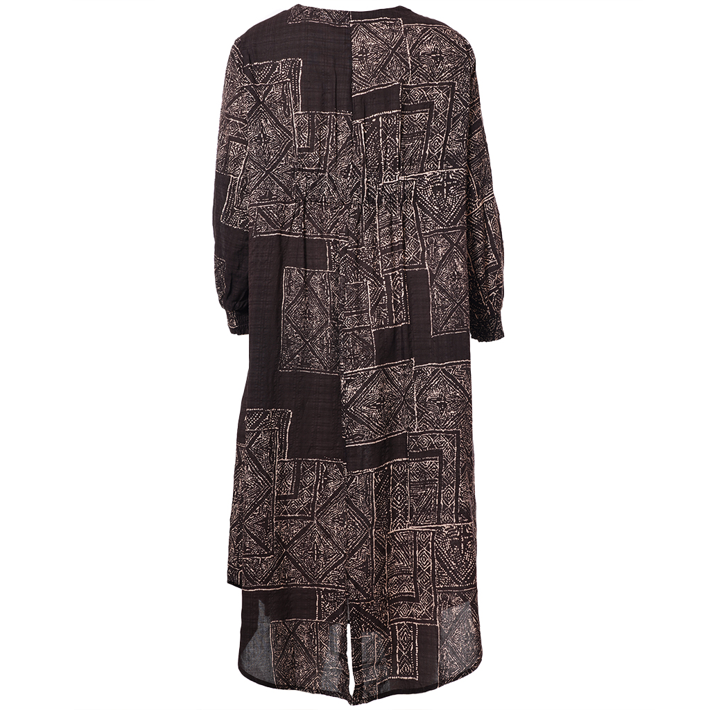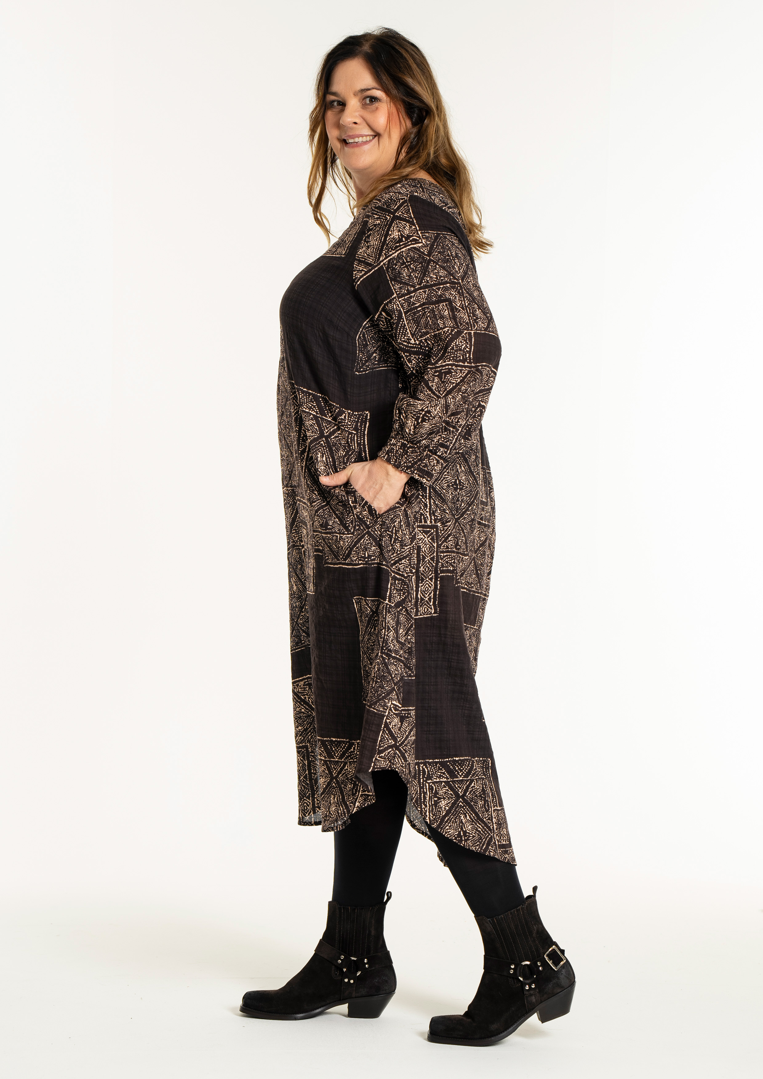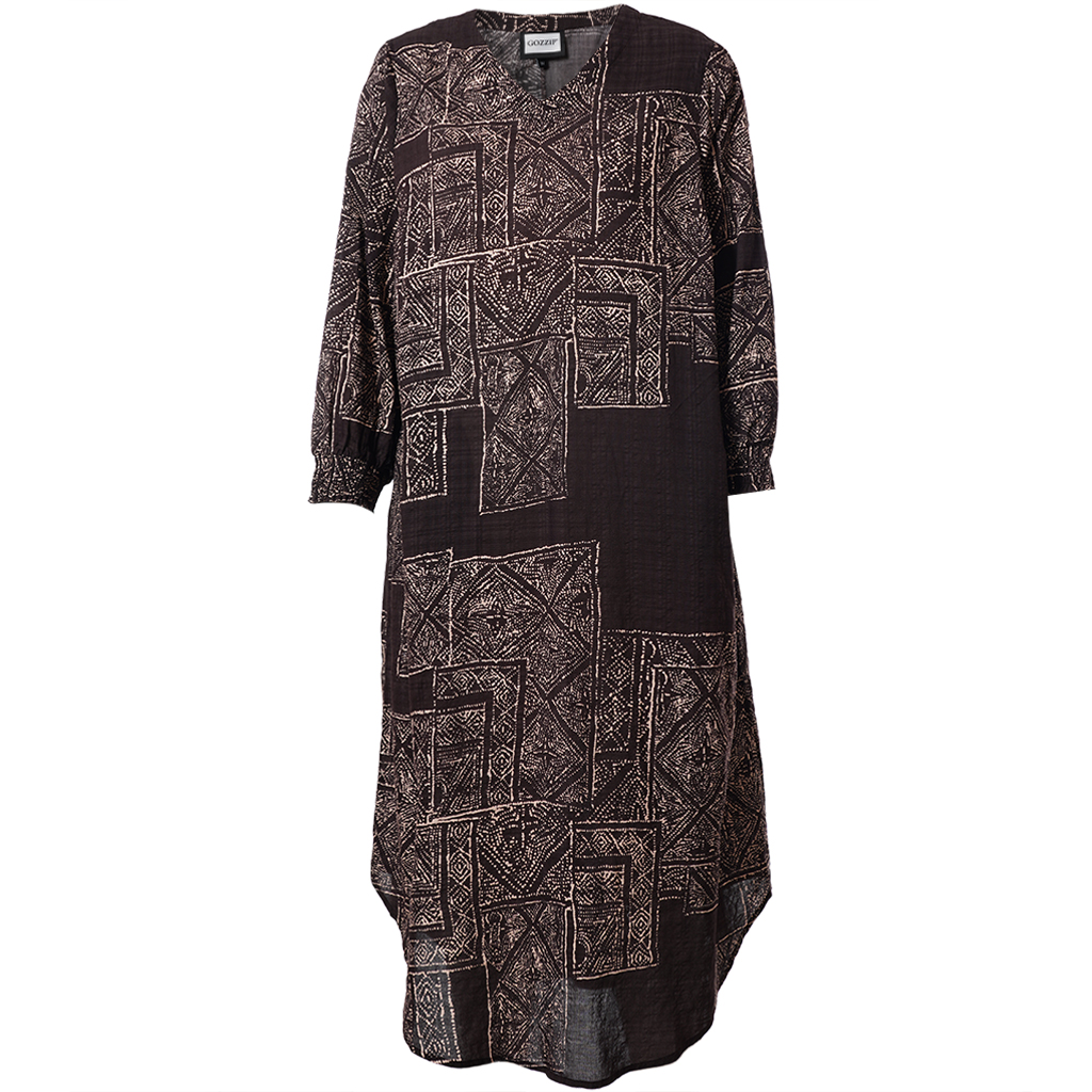 De Gozzip Jurk Amelia is een losvallende jurk gemaakt van niet-stretch materiaal met een donkere basis en een opvallende beige geometrische print. De jurk heeft een v-hals en lange mouwen met elastische manchetten voor extra comfort. Daarnaast heeft de jurk praktische zakken aan de zijkant.