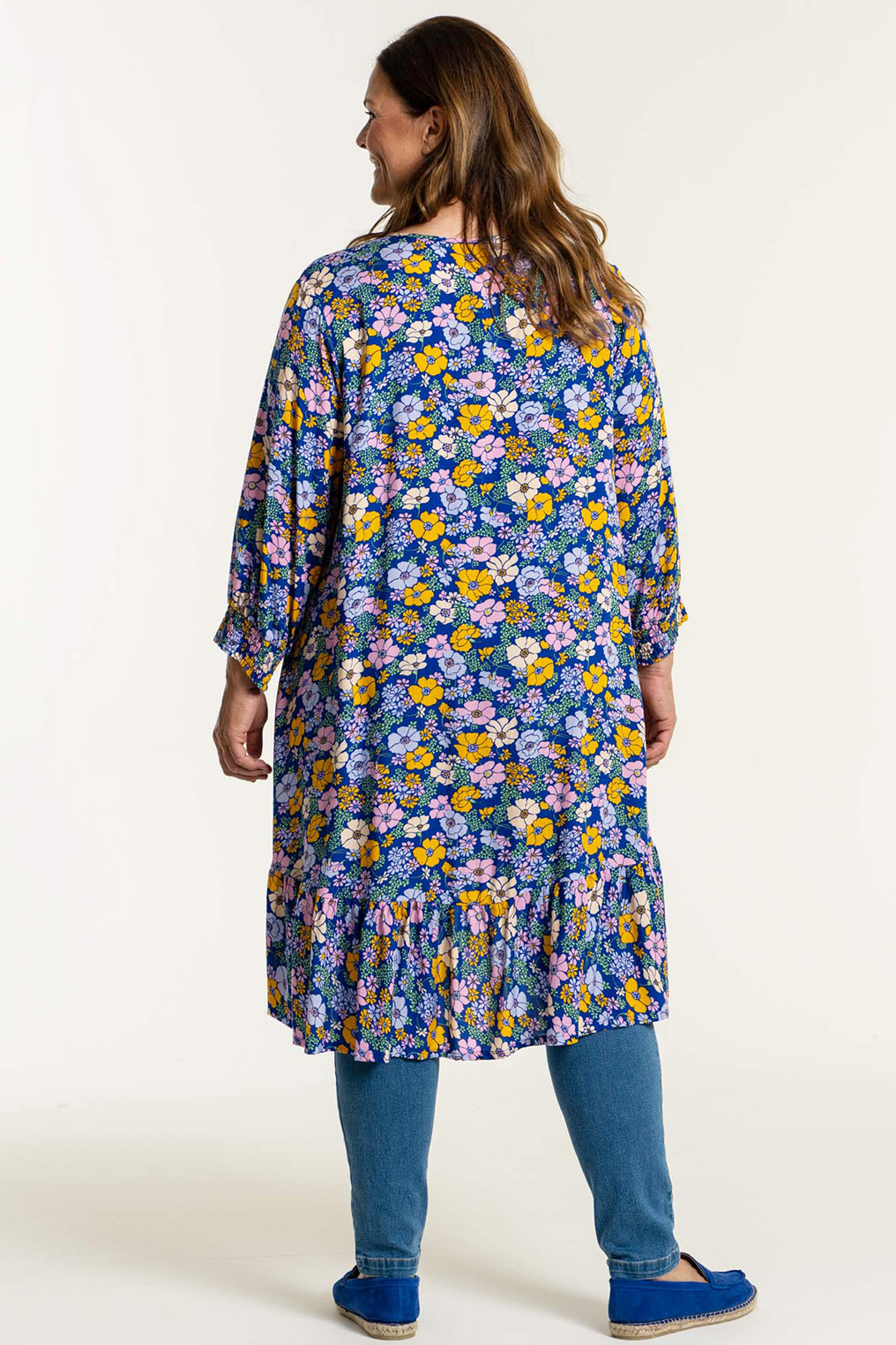Gozzip tuniek Alina heeft aan de onderkant een brede ruche rand. Hij heeft een ronde hals, sluit met knoopjes en heeft 3/4e mouwen met een manchet.  In het voorpand zitten steekzakken. De tuniek is gemaakt in een prachtige viscose kwaliteit. De lengte bij maat M is hij voor 99cm, achter is hij 111cm. De mooiste tunieken vind je in de categorie grote maten tunieken.