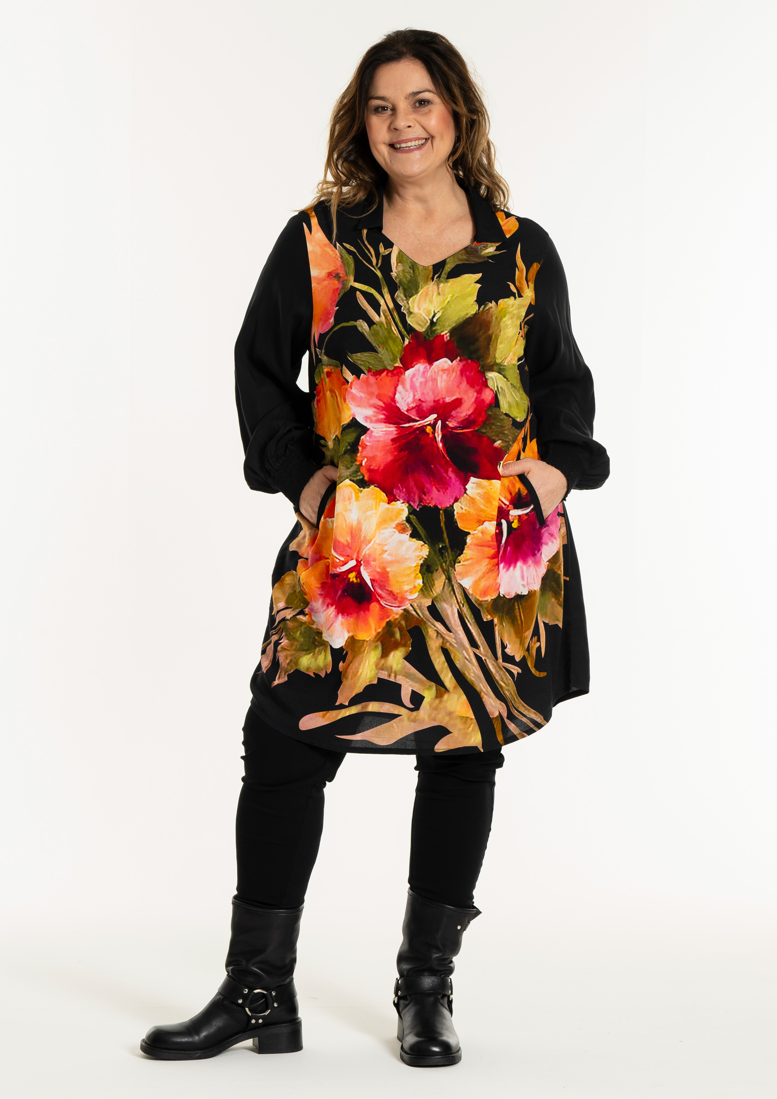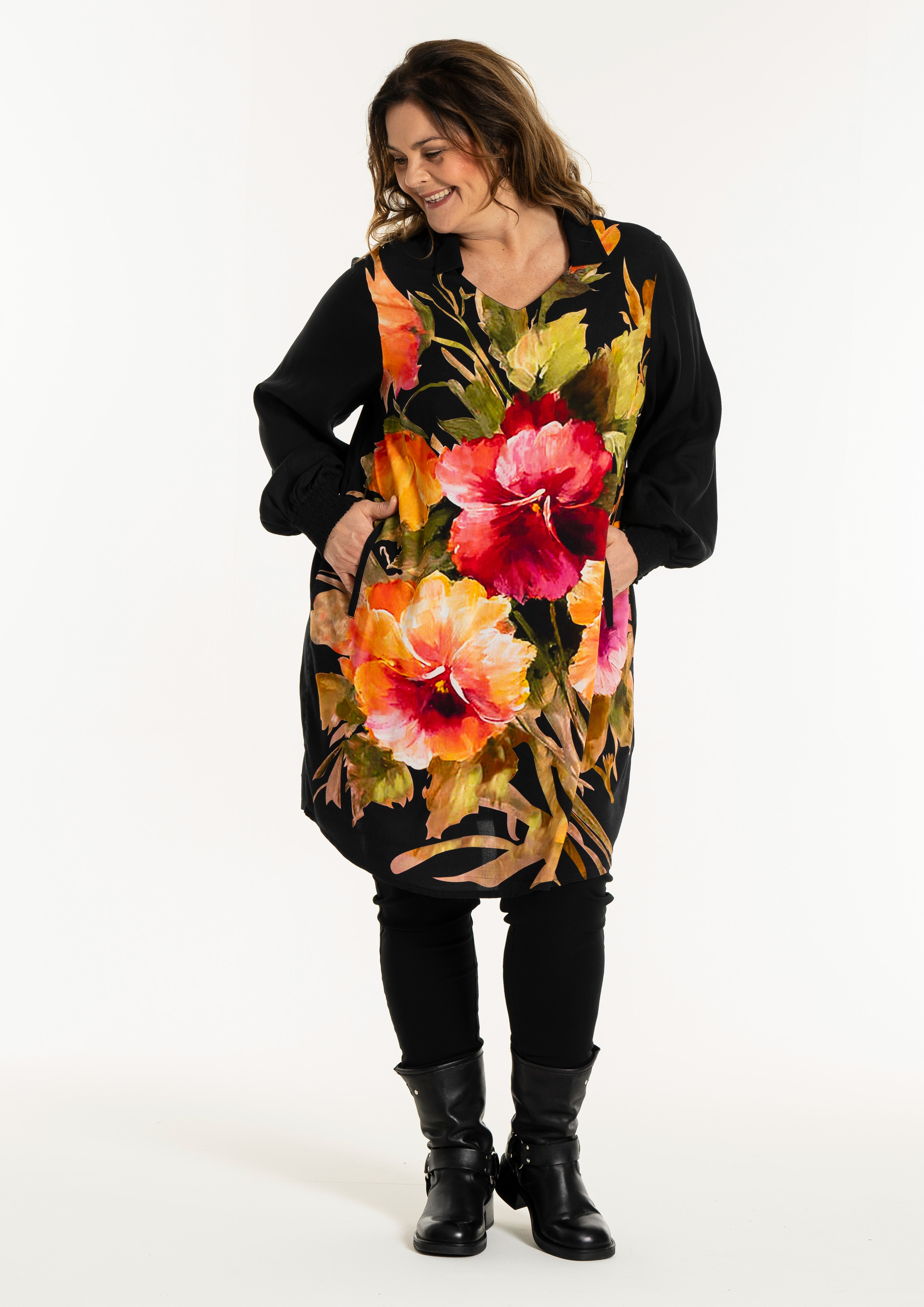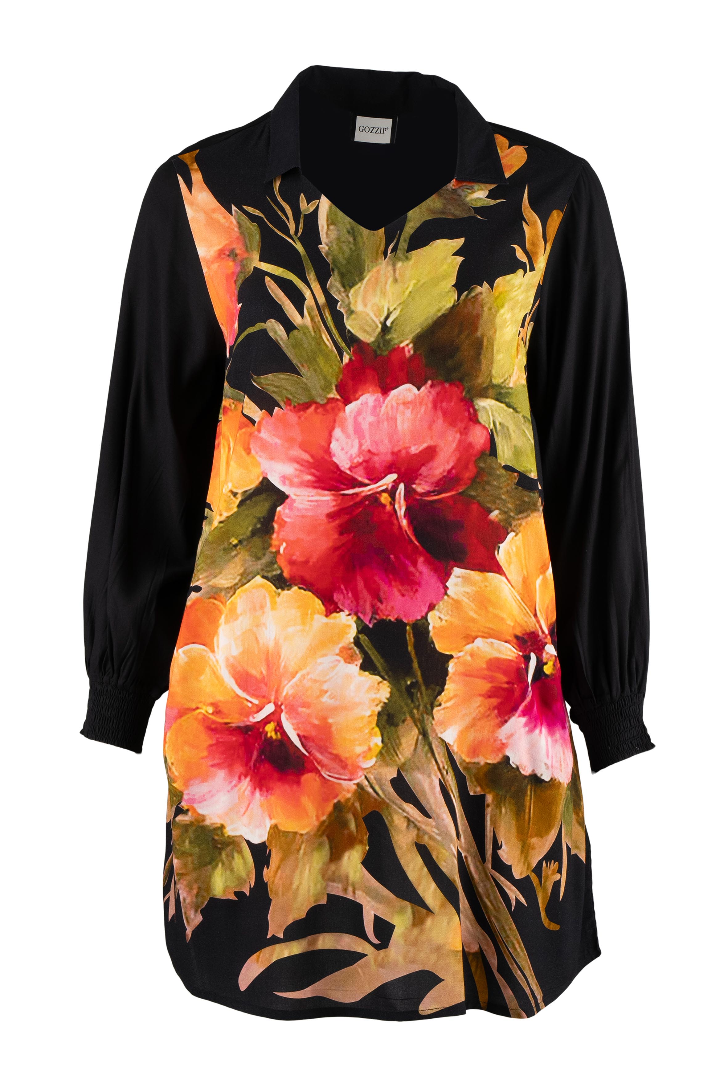 De Gozzip Tuniek Ava is een niet-stretch tuniek met een opvallende grote bloemenprint in warme tinten op een zwarte basis. De tuniek heeft lange mouwen met elastische manchetten, een klassieke kraag en een v-hals. Praktische zakken aan de zijkant maken dit comfortabele en stijlvolle kledingstuk compleet.