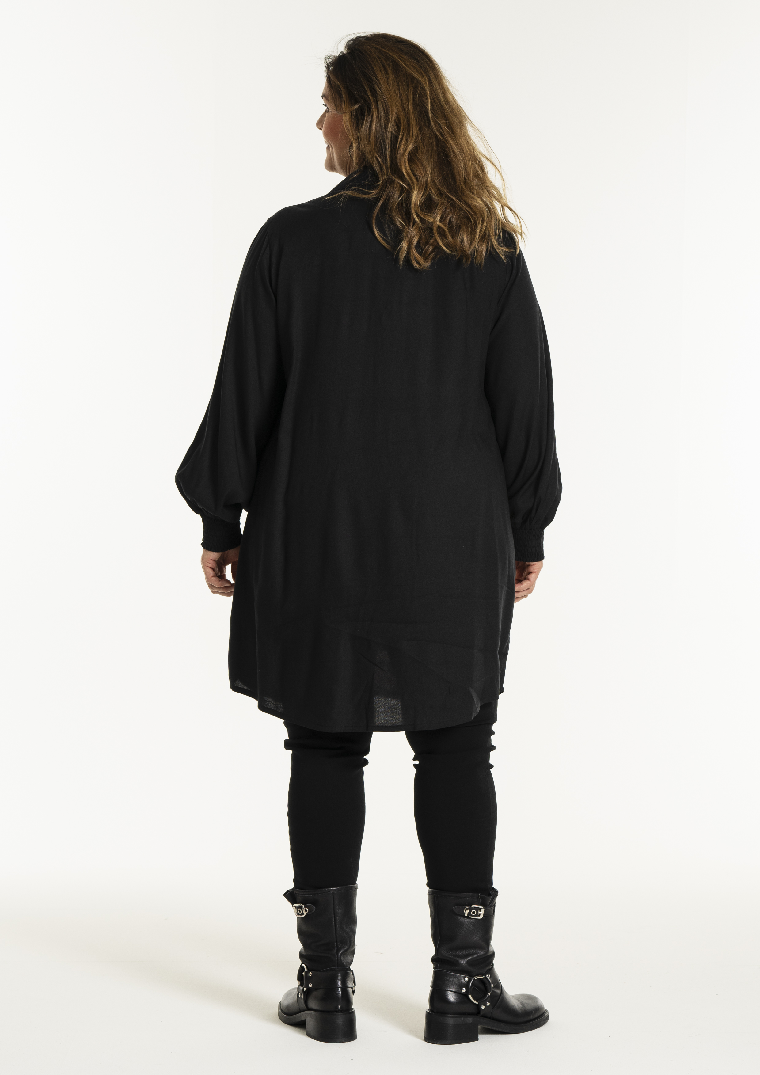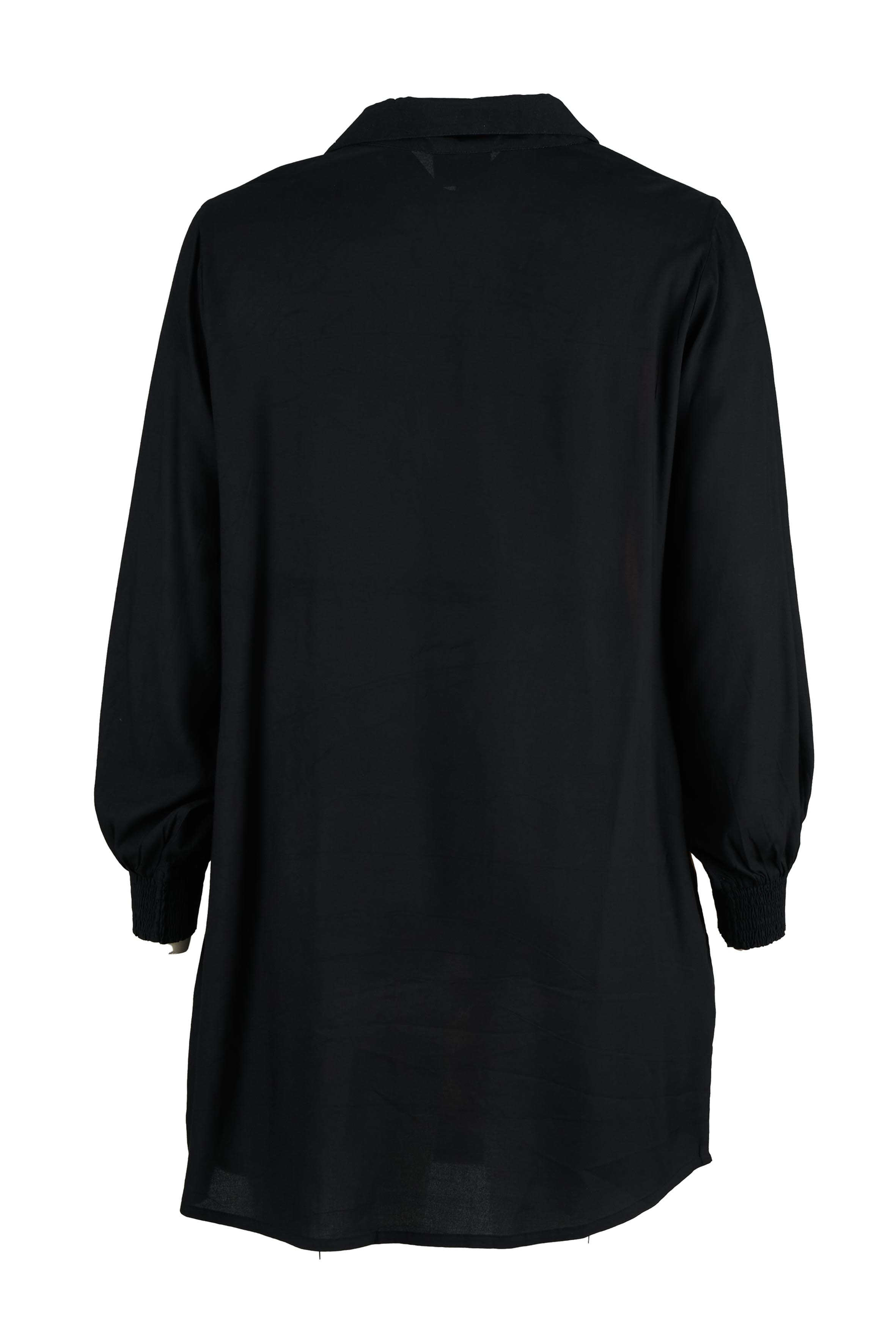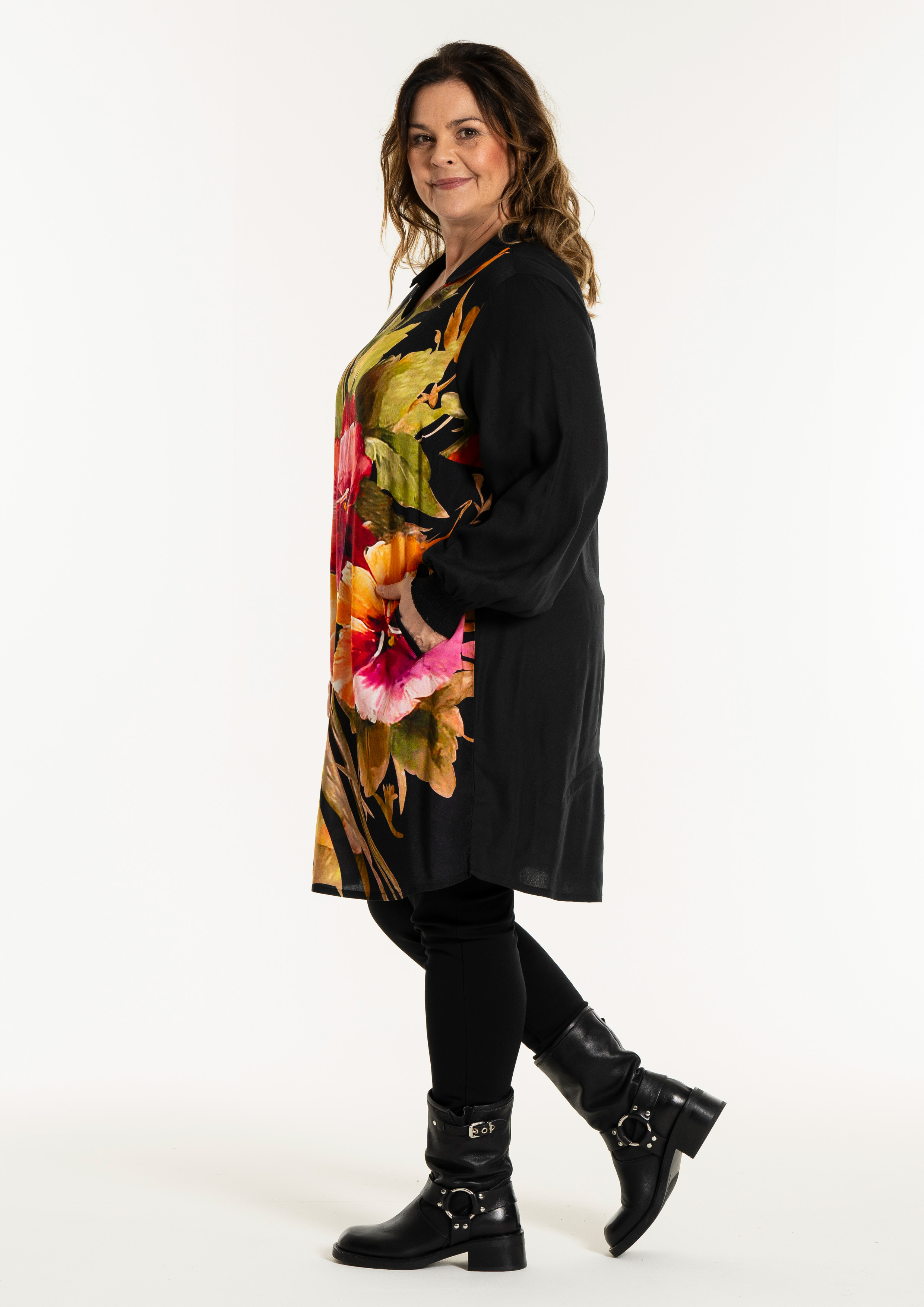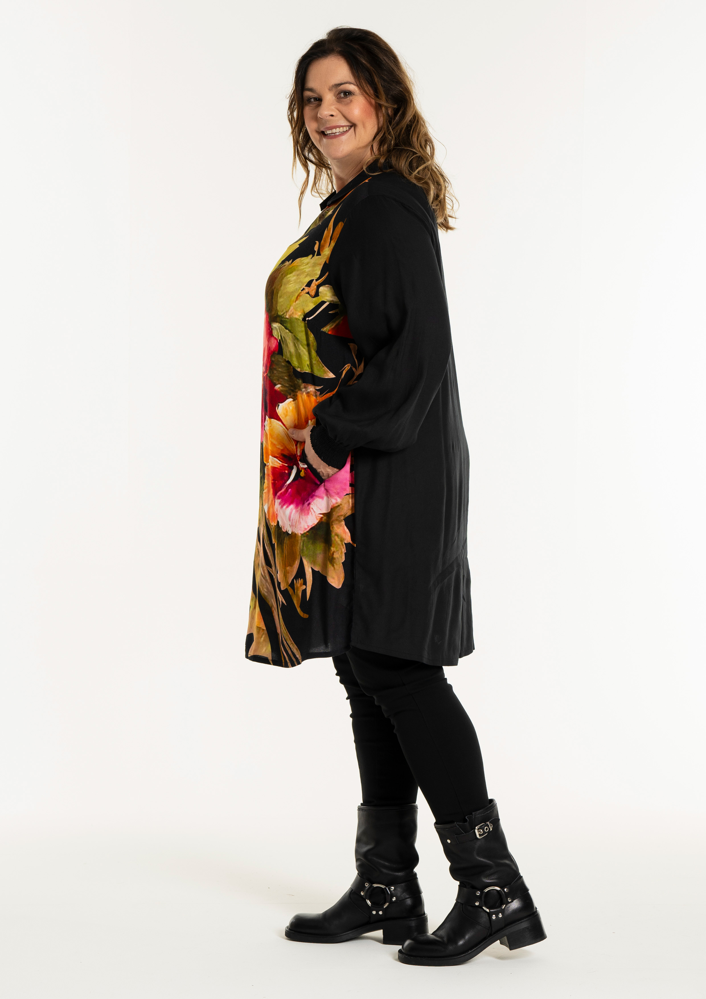 De Gozzip Tuniek Ava is een niet-stretch tuniek met een opvallende grote bloemenprint in warme tinten op een zwarte basis. De tuniek heeft lange mouwen met elastische manchetten, een klassieke kraag en een v-hals. Praktische zakken aan de zijkant maken dit comfortabele en stijlvolle kledingstuk compleet.