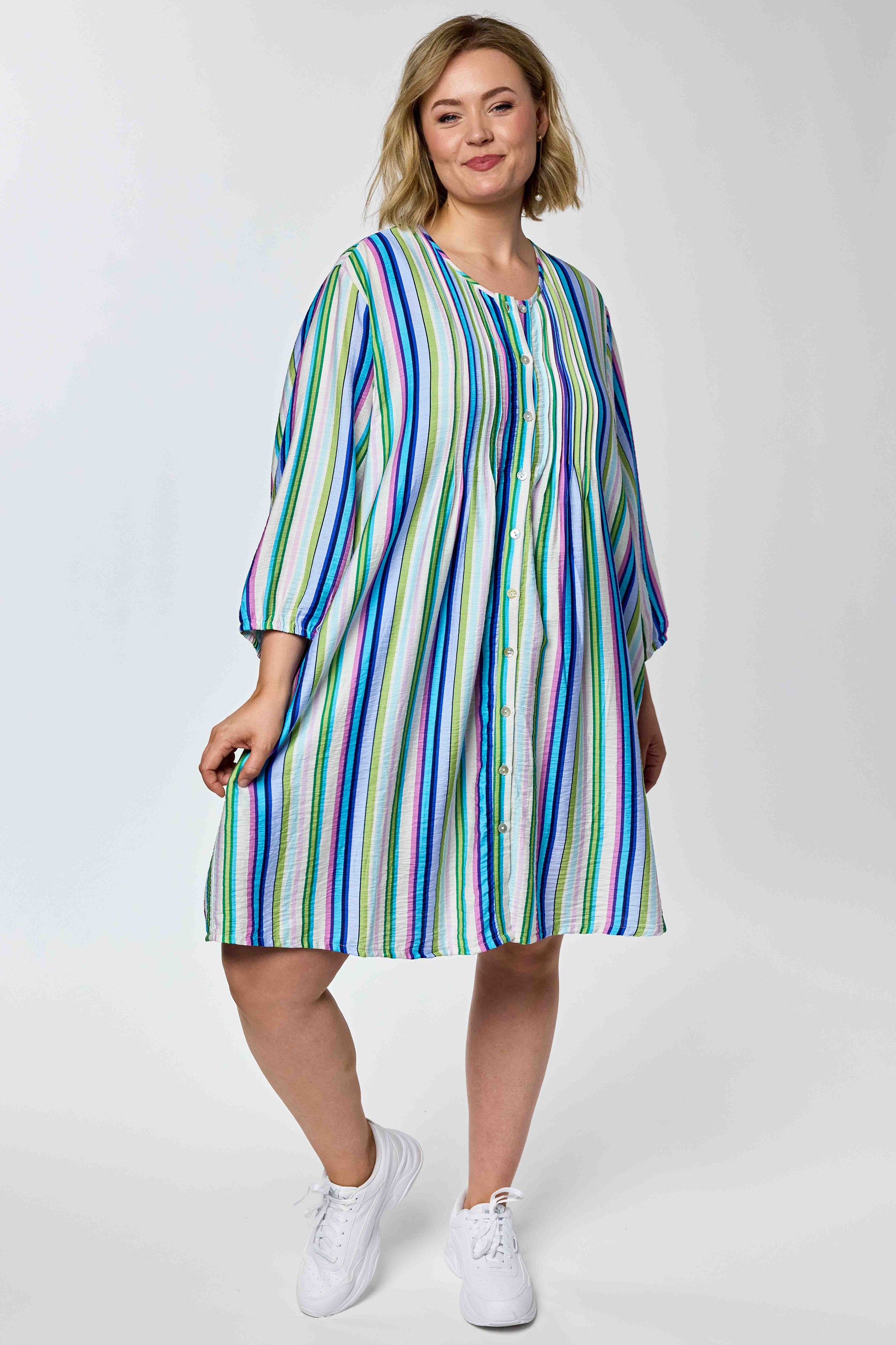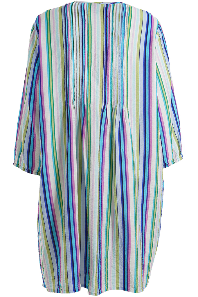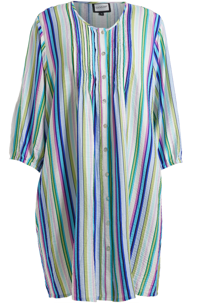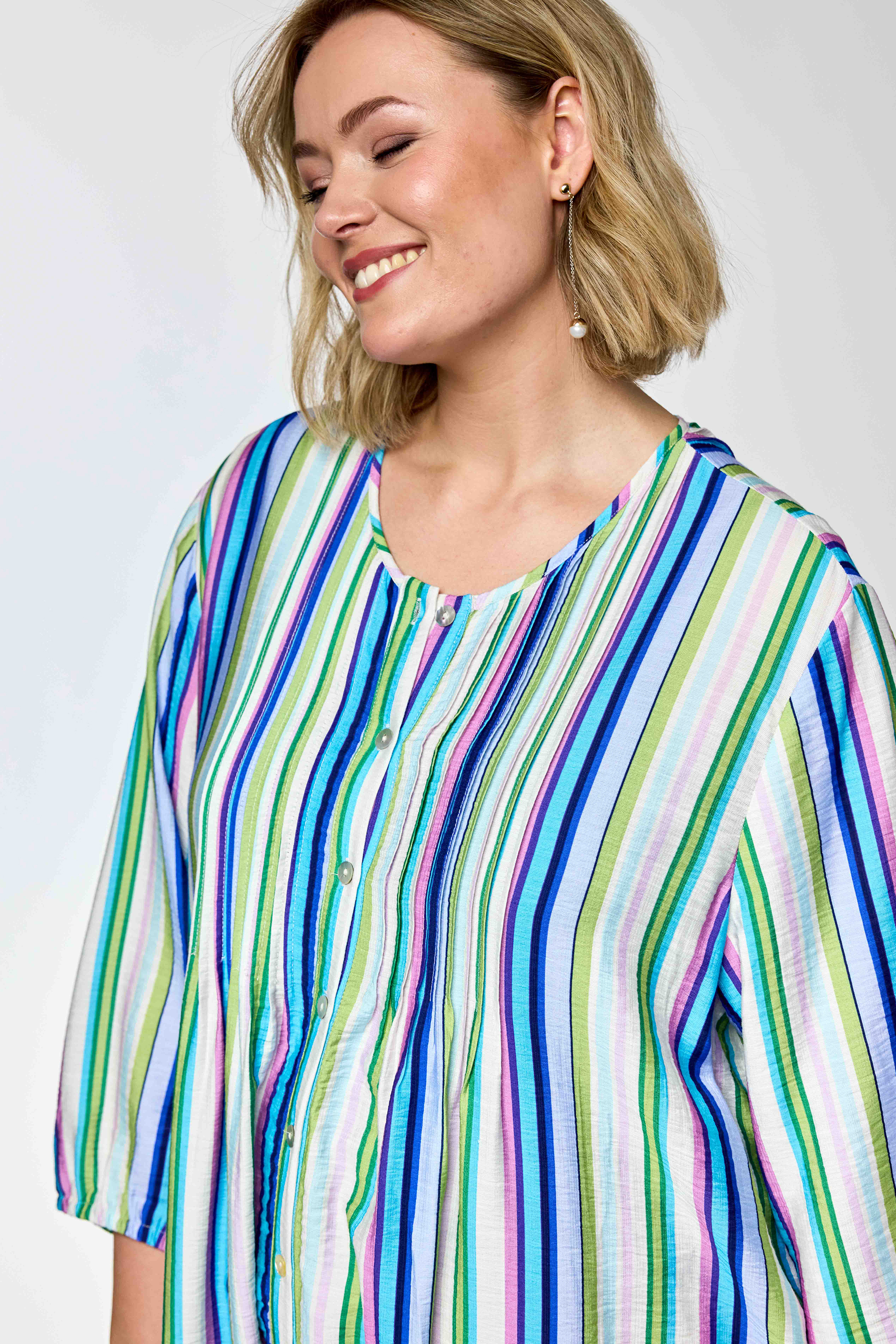 De Johanne Tuniek G262044 heeft een doorlopende knoopsluiting en lange mouwen. De lengte van deze tuniek is 106 cm en valt tot op de knie. Hierdoor kun je dit model zowel los dragen als combineren met een broek of legging. Het gestreepte dessin geeft een grafische en moderne uitstraling, terwijl de snit zorgt voor comfort in het dagelijks gebruik.