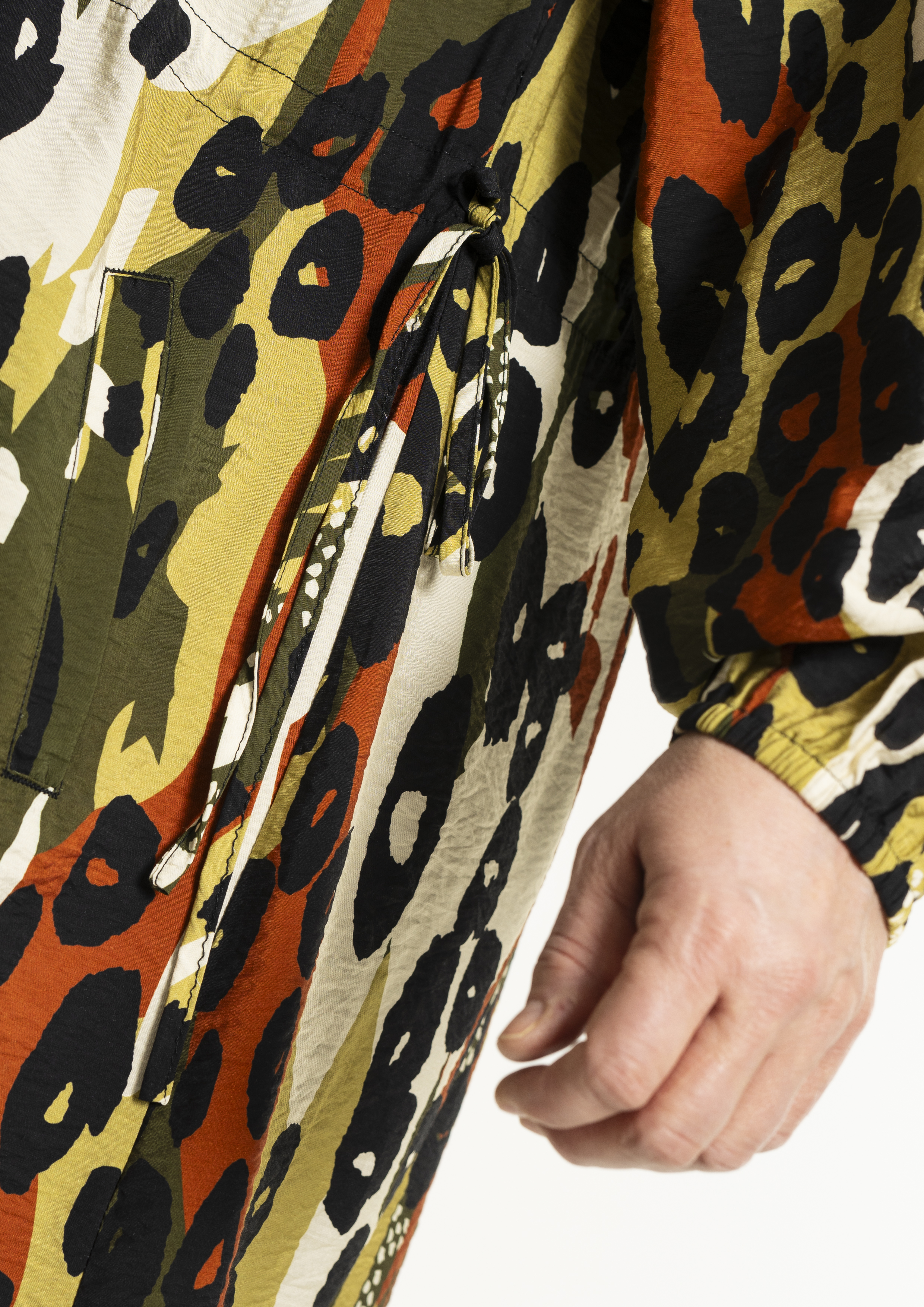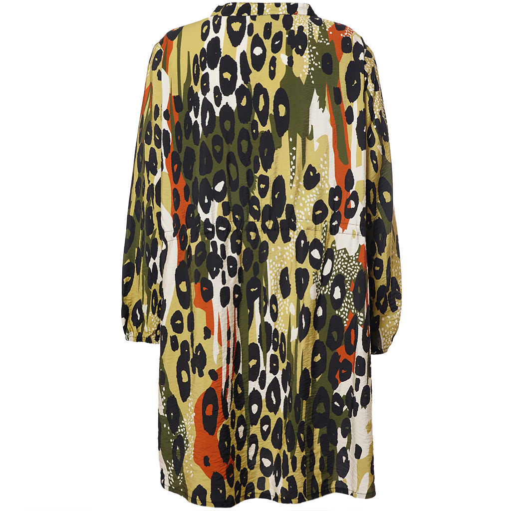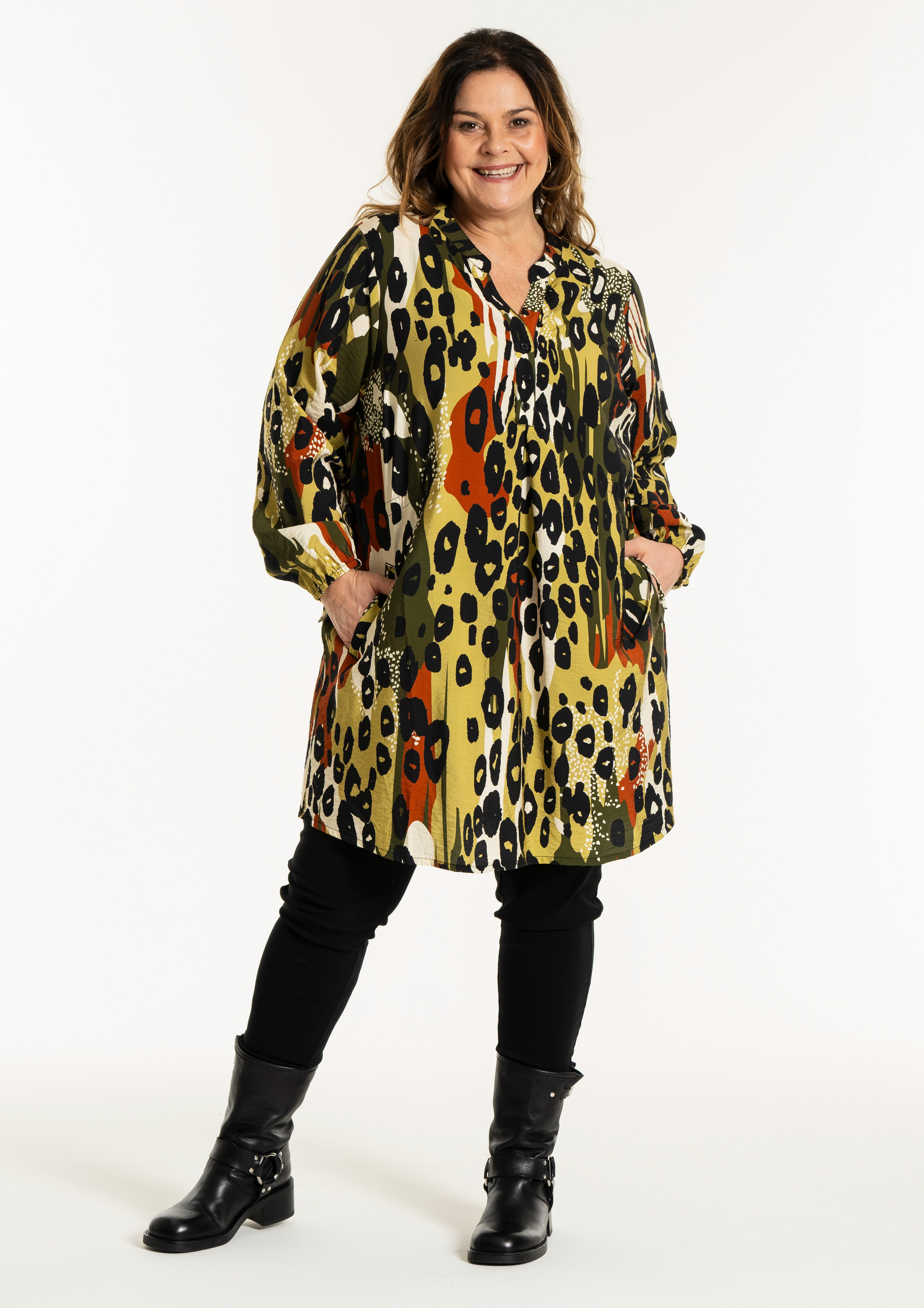 De Gozzip Tuniek Nora is een luchtige, niet-gestretch tuniek met een opvallende dierenprint in groene en oranje tinten. Het model heeft een V-hals en een strik in de taille voor een vrouwelijke, gestructureerde look. De tuniek is voorzien van een knoopsluiting aan de voorkant en elastische bandjes aan de mouwen voor een subtiele, geplooide afwerking. Het lichte materiaal maakt de tuniek ideaal voor de warmere maanden, en de vrolijke print zorgt voor een opvallende uitstraling.