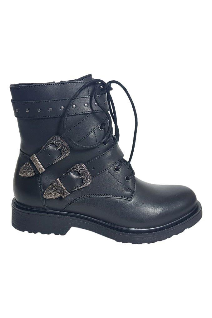 Stoere boot van JJ Footwear. Middenvoor heeft dit model een veter sluiting. Hieroverheen zitten 2 verstelbare gespen. Rond om de enkel zit nog een extra riempje met kleine studs. Aan de binnenkant van het laarsje zit een rits opening. Zo kom je er makkelijk in. Alle JJ Footwear laarzen en boots hebben uitneembaar voetbed. Dit model is gemaakt in een mooie leersoort.