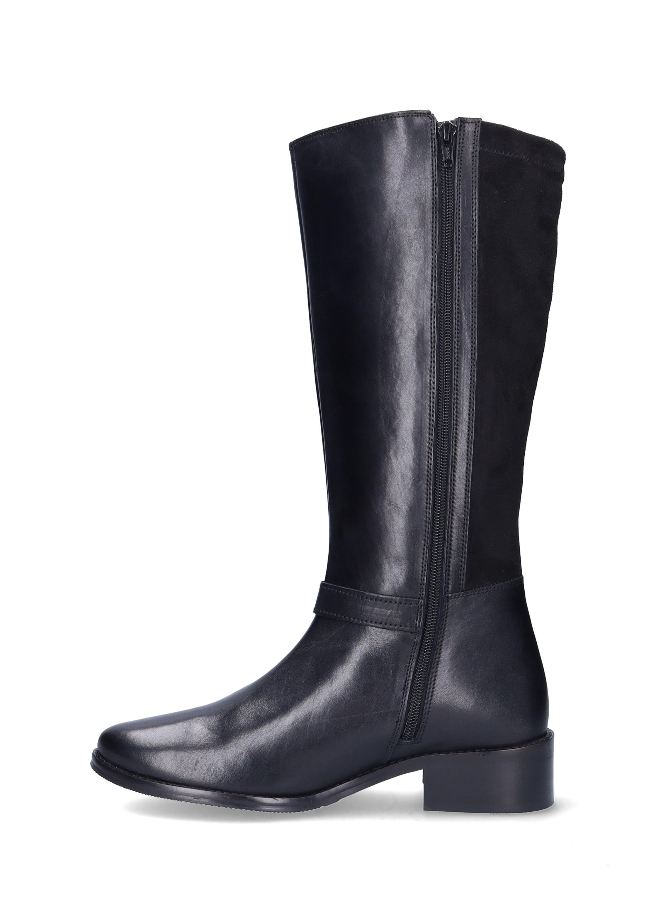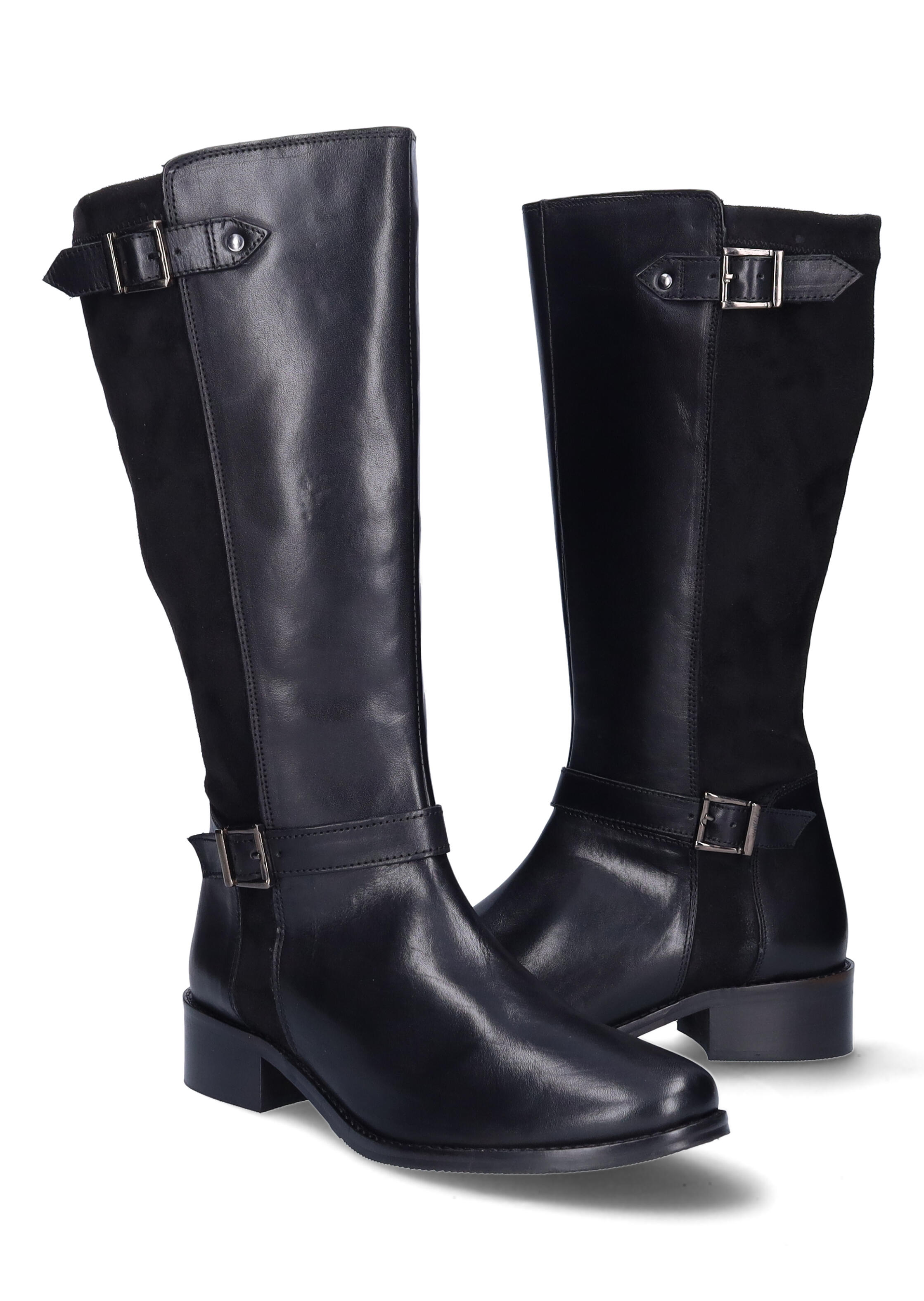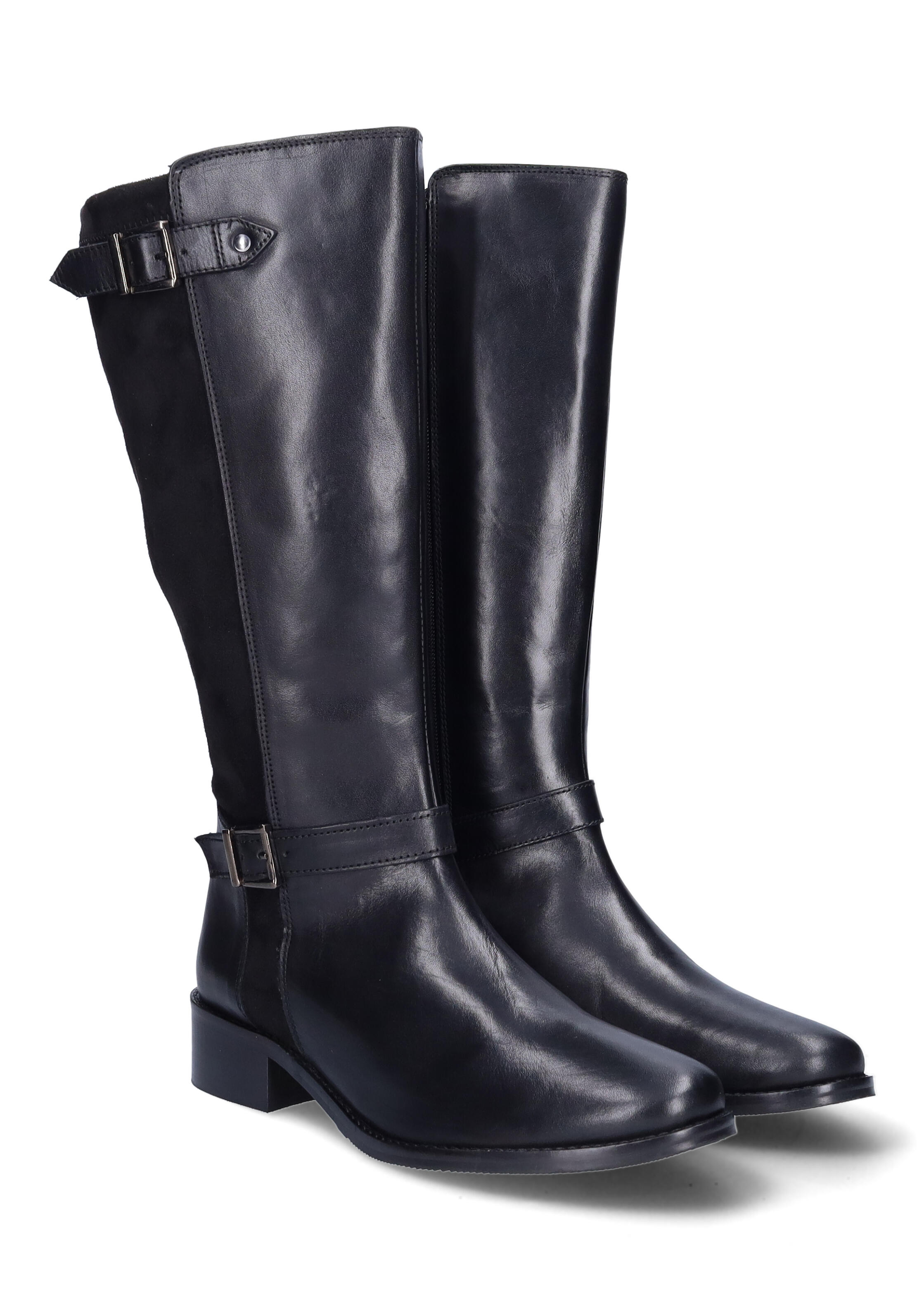 De Tedbury van JJ Footwear is een zwartleren dameslaars met suède stretch materiaal op de kuit. Beschikt over een verstelbare decoratieve gesp. Verkrijgbaar in diverse wijdtes (XS t/m XXXL). Flexibele antislipzool, uitneembaar voetbed voor het gebruik van steunzolen. Hakhoogte: 2,5 cm.
