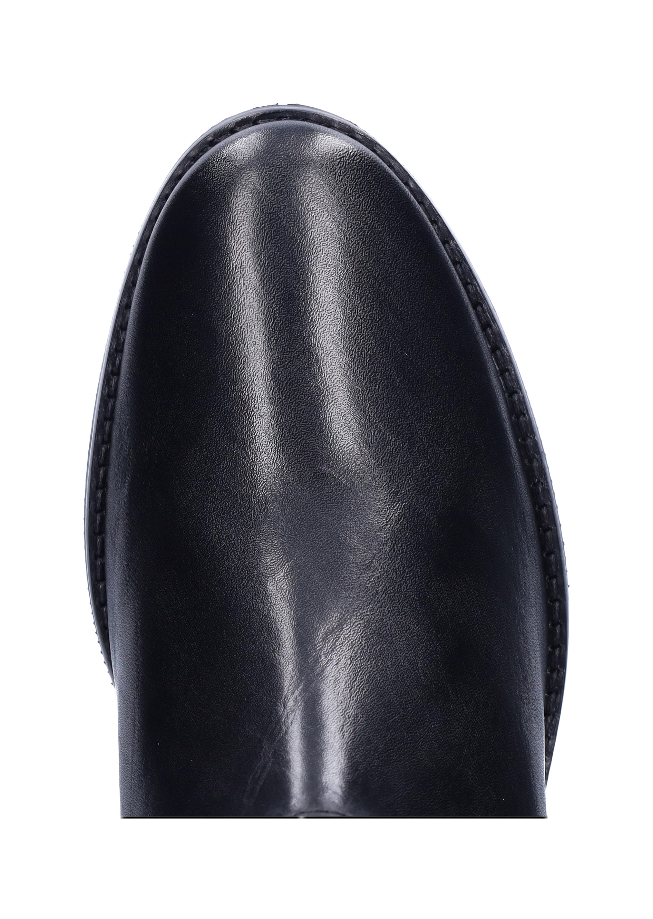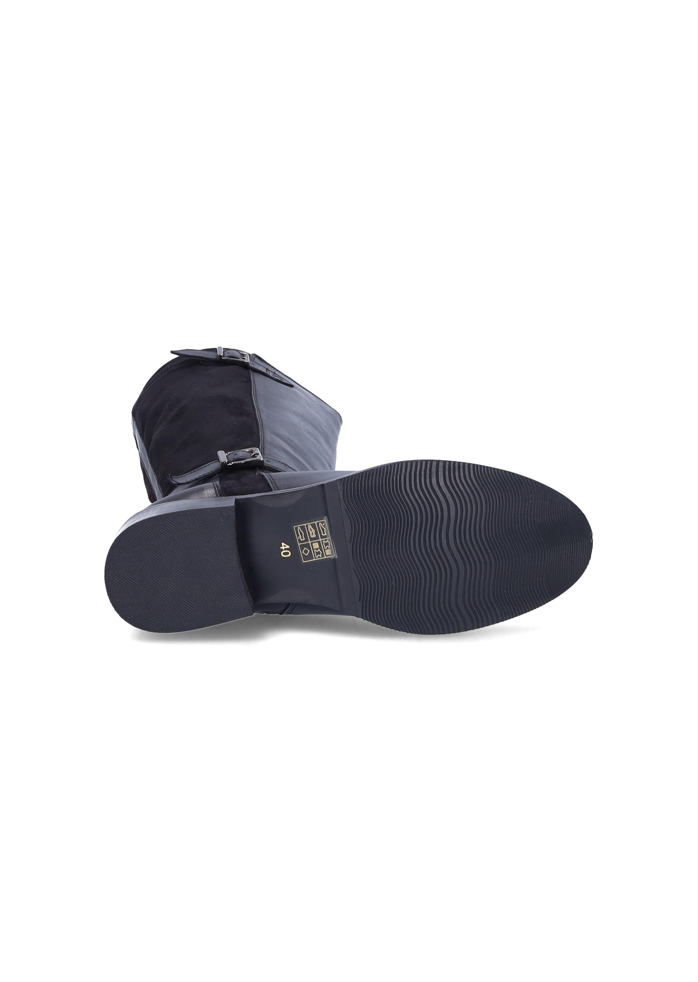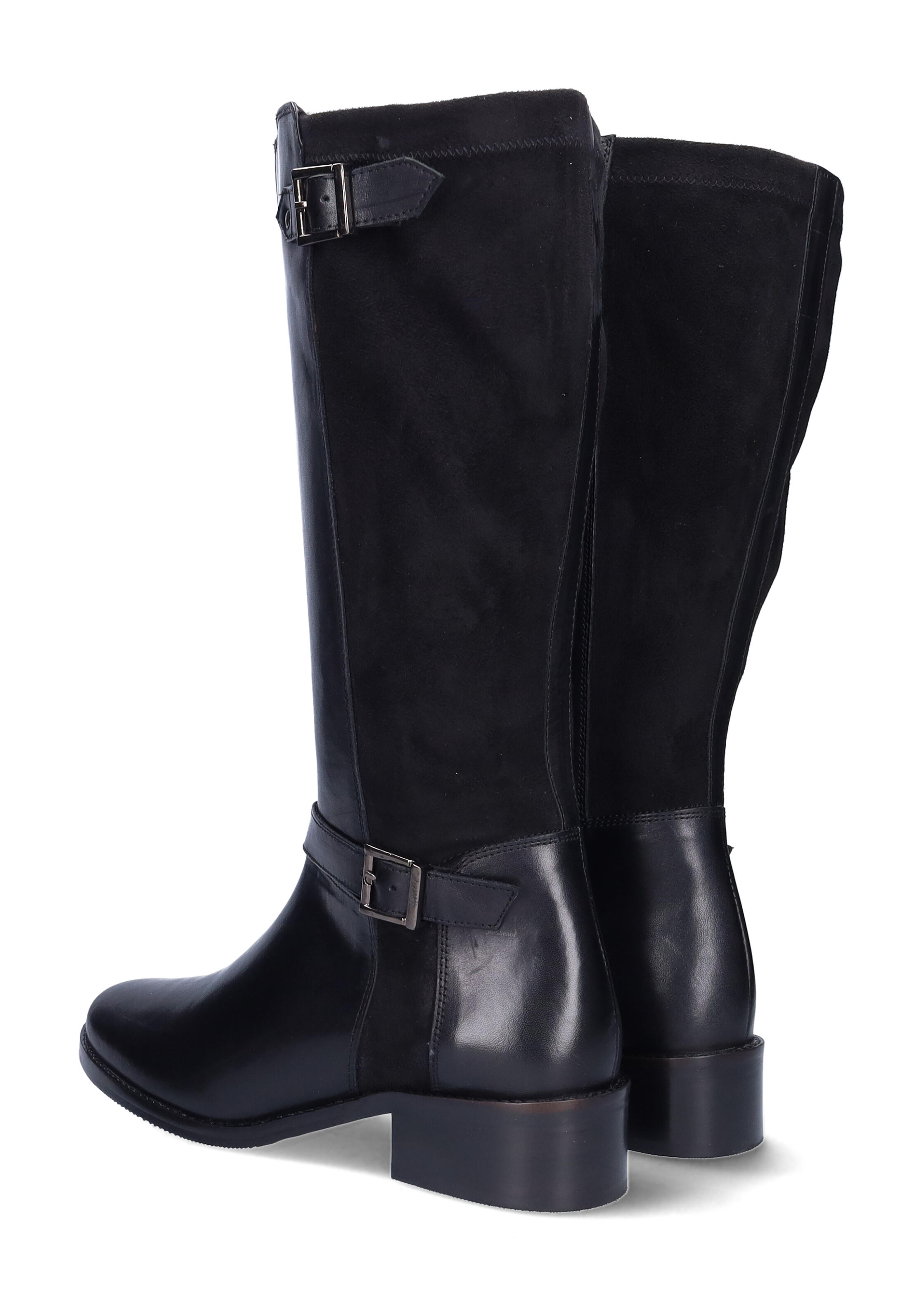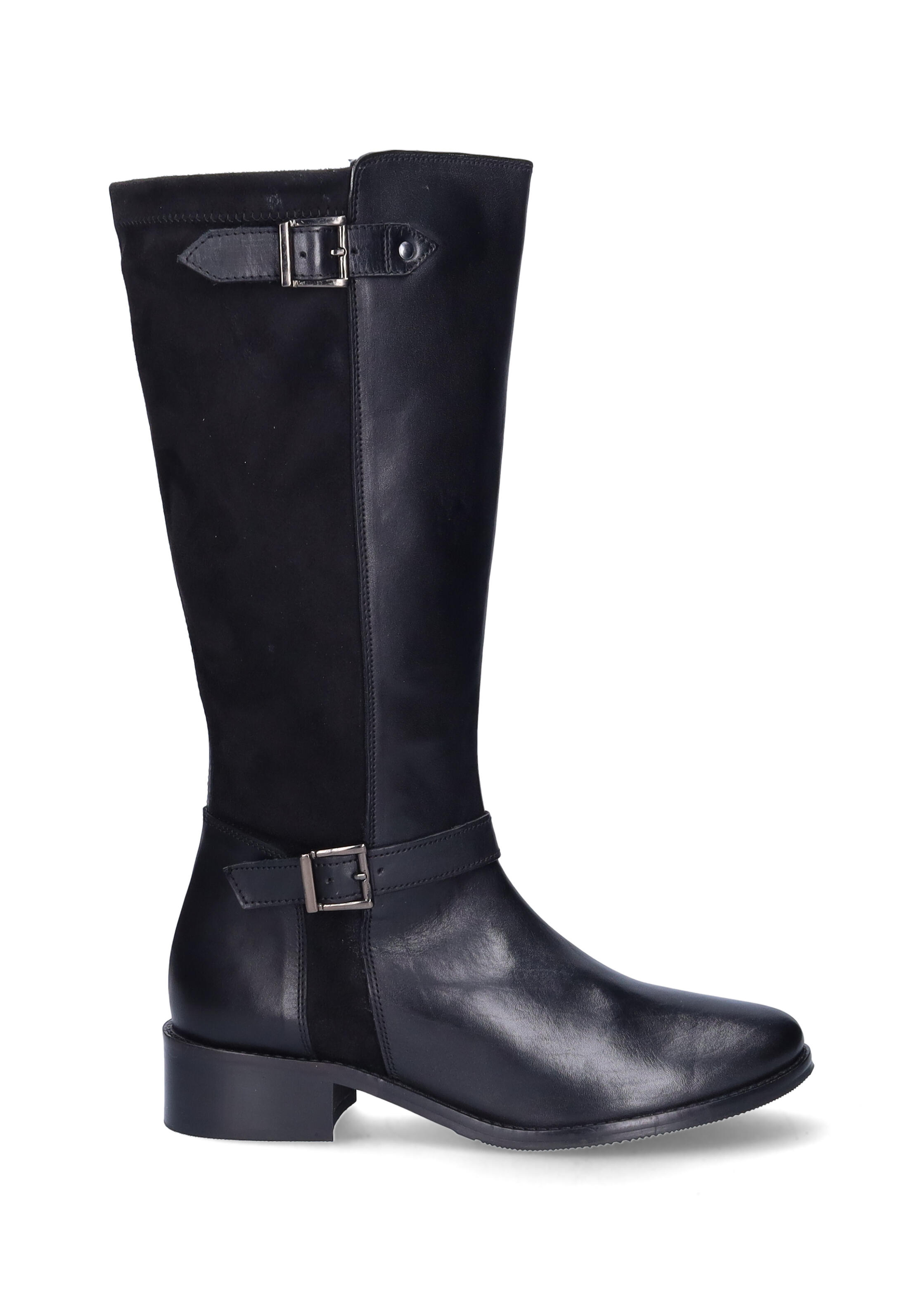 De Tedbury van JJ Footwear is een zwartleren dameslaars met suède stretch materiaal op de kuit. Beschikt over een verstelbare decoratieve gesp. Verkrijgbaar in diverse wijdtes (XS t/m XXXL). Flexibele antislipzool, uitneembaar voetbed voor het gebruik van steunzolen. Hakhoogte: 2,5 cm.