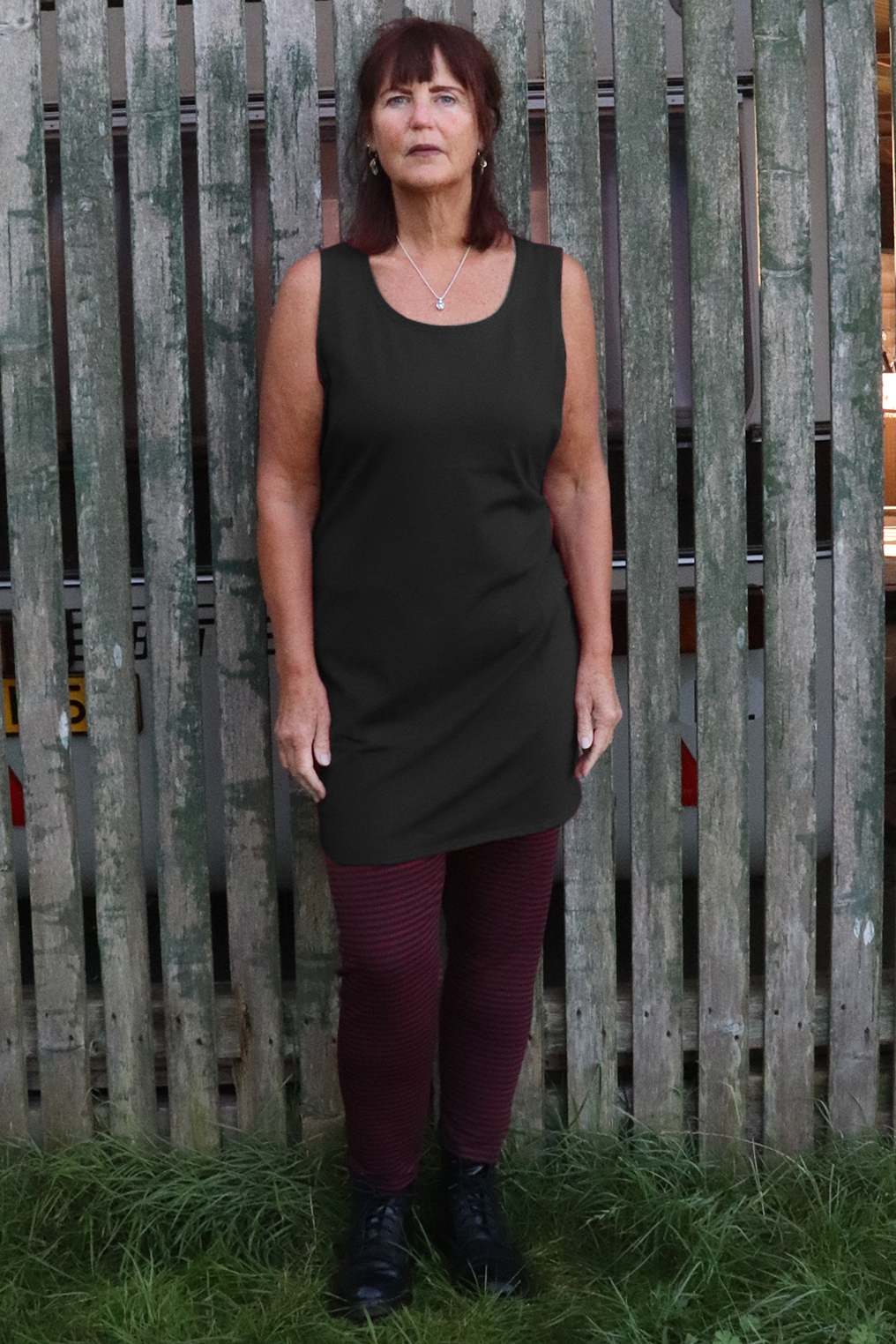 Handige basisjurk van Boris, hij is gemaakt in een super fijne tricot met een zachte binnenkant. Dat draagt toch fijn!  Ik hoor je denken, waarom mouwloos in het najaar, draag er een vest of trui overheen. Voordeel is geen 2 keer lange mouwen, maar goed om ook binnenshuis te dragen, anders wordt het gauw weer te warm. Het is een licht aangesloten model, let daarbij op met het bestellen van de juiste maat. Hieronder zit je streep legging 3123.