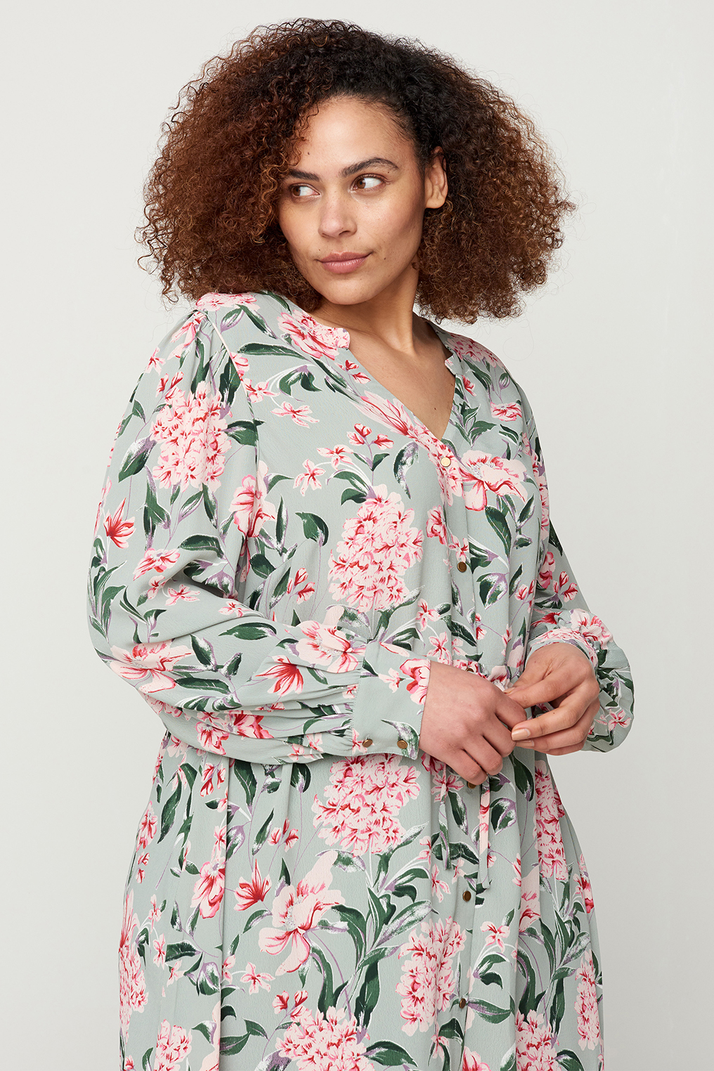 Wat een zwierige zomer jurk van Zizzi. Hij zit normaal aan de bovenkant en loopt naar onderen wijder uit. Hij heeft een V hals en een smal boordje en is geheel doorknoop met kleine goudkleurige knoopjes. In de taille zit een tunnel met een aantrekkoord. De lange mouwen hebben een poffend effect en een smalle manchet. De stof heeft een licht crepe effect. De jurk valt over de knie.