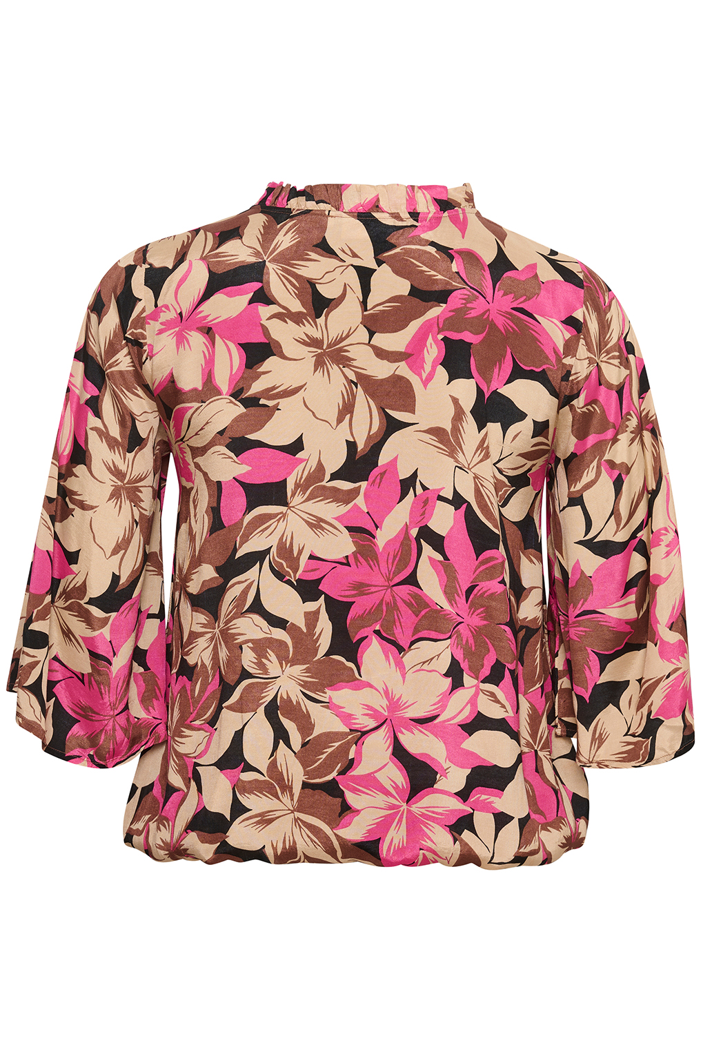 Kaffe Curve blouse Dory heeft leuke uitlopende mouwen met een driekwart lengte. Hij heeft een ronde hals met V split en smal opstaand ruche randje en strikkoordje. In de zoom zit elastiek. De ECO viscose stof heeft een lichte glans. De blouse heeft een lengte van 75 cm bij maat 44.