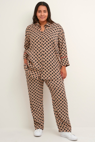 Kaffe curve broek Qing heeft een super leuke print in een mooie ECO viscose. Het is een rondom elastiek model met zakken in de zijnaad. De broek is een halfwijd model die gewoon lang valt. Hij heeft een binnenbeen lenge van 78cm. Blouse 10580267 is een prima combinatie bij deze print broek, de kleuren passen hier super bij.
