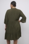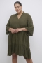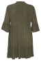 Kaffe Curve eco jurk Lio is gemaakt in een ECO viscose crincle stof met een zilverkleurig glansdraadje. De jurk heeft een V hals met een kleine ruche strookje en driekwart mouwen met een trompet effect. Aan de onderkant zit een brede ruche strook. Hij heeft een lengte van 107cm bij maat 46. Natuurlijk combineer je deze leuke jurk met een panty uit de collectie van Cette of Pamela Mann.