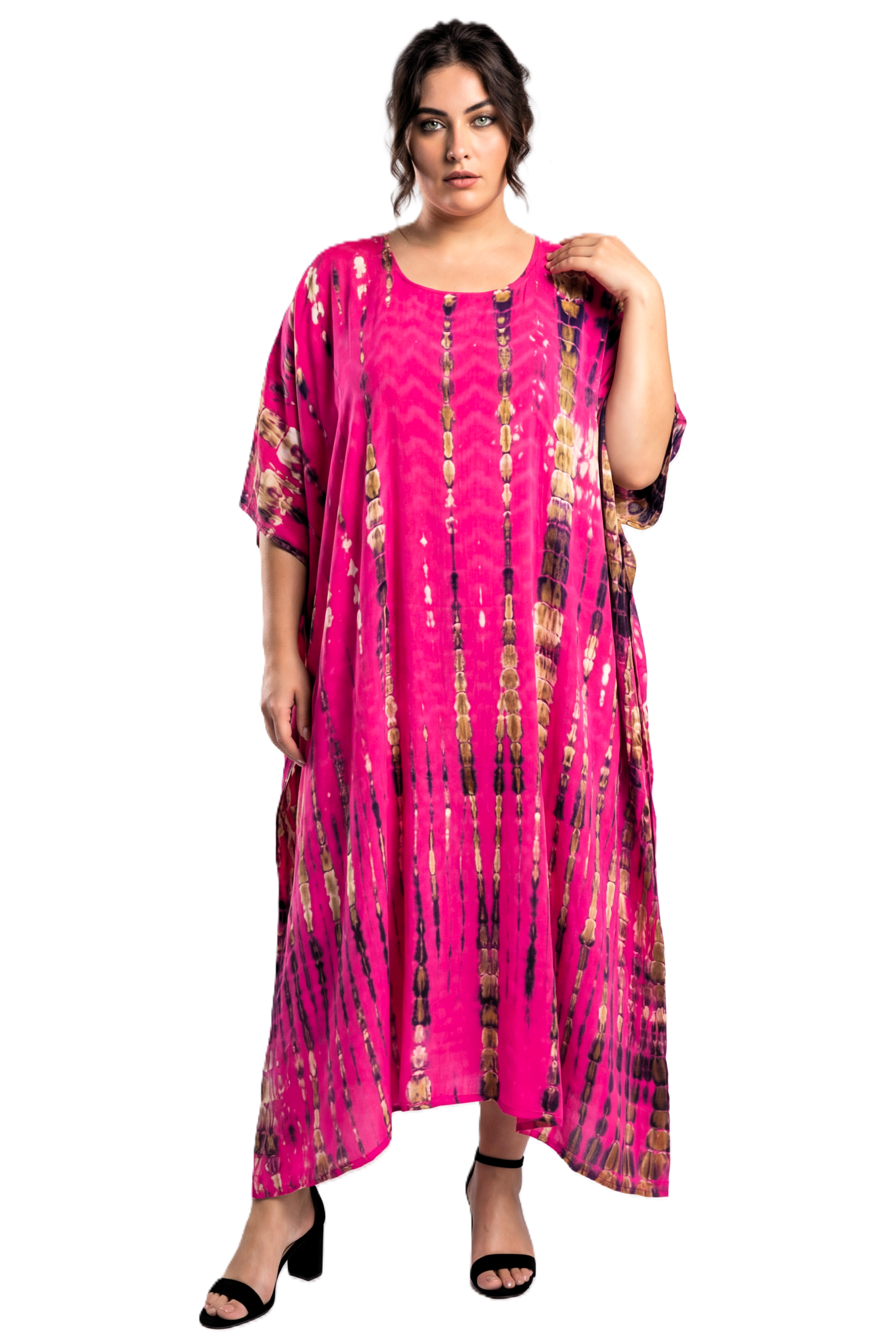 De Luna kaftan Classic jurk van Luna heeft een opvallende diverse printen. Door het wijde model valt de jurk luchtig om het lichaam. Dit maakt deze kaftan jurk een fijne keuze voor vrouwen die houden van comfortabele plus size kleding met een modieuze uitstraling. De ruime mouwen vallen los langs de armen en geven de jurk een speelse en luchtige look.
