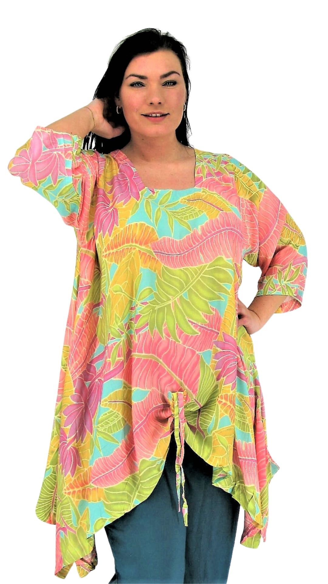 Aparte stijlvolle tuniek van Luna Serena met mouw en ophaalkoordje van voren. Wijdvallend model in big size, zeker tot en met maat 60. Dit model heeft een 4 kante hals inzet en 7/8 mouwen die wat wijder vallen. Door de wijdte van dit model vallen de zijkanten in punten. Middenvoor lengte valt over het kruis. Hiet zit een aantrekkoord. De tuniek is gemaakt in een mooie viscose stof.