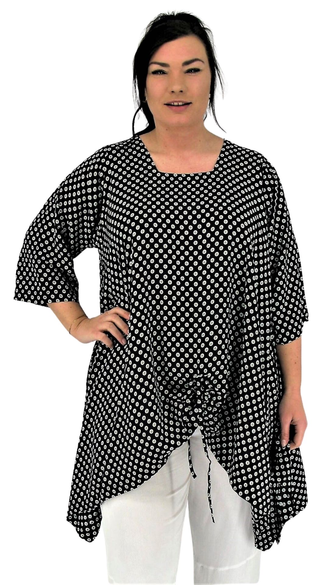 Aparte stijlvolle tuniek van Luna Serena met mouw en ophaalkoordje van voren. Wijdvallend model in big size, zeker tot en met maat 60. Dit model heeft een 4 kante hals inzet en 7/8 mouwen die wat wijder vallen. Door de wijdte van dit model vallen de zijkanten in punten. Middenvoor lengte valt over het kruis. Hiet zit een aantrekkoord. De tuniek is gemaakt in een mooie viscose stof.