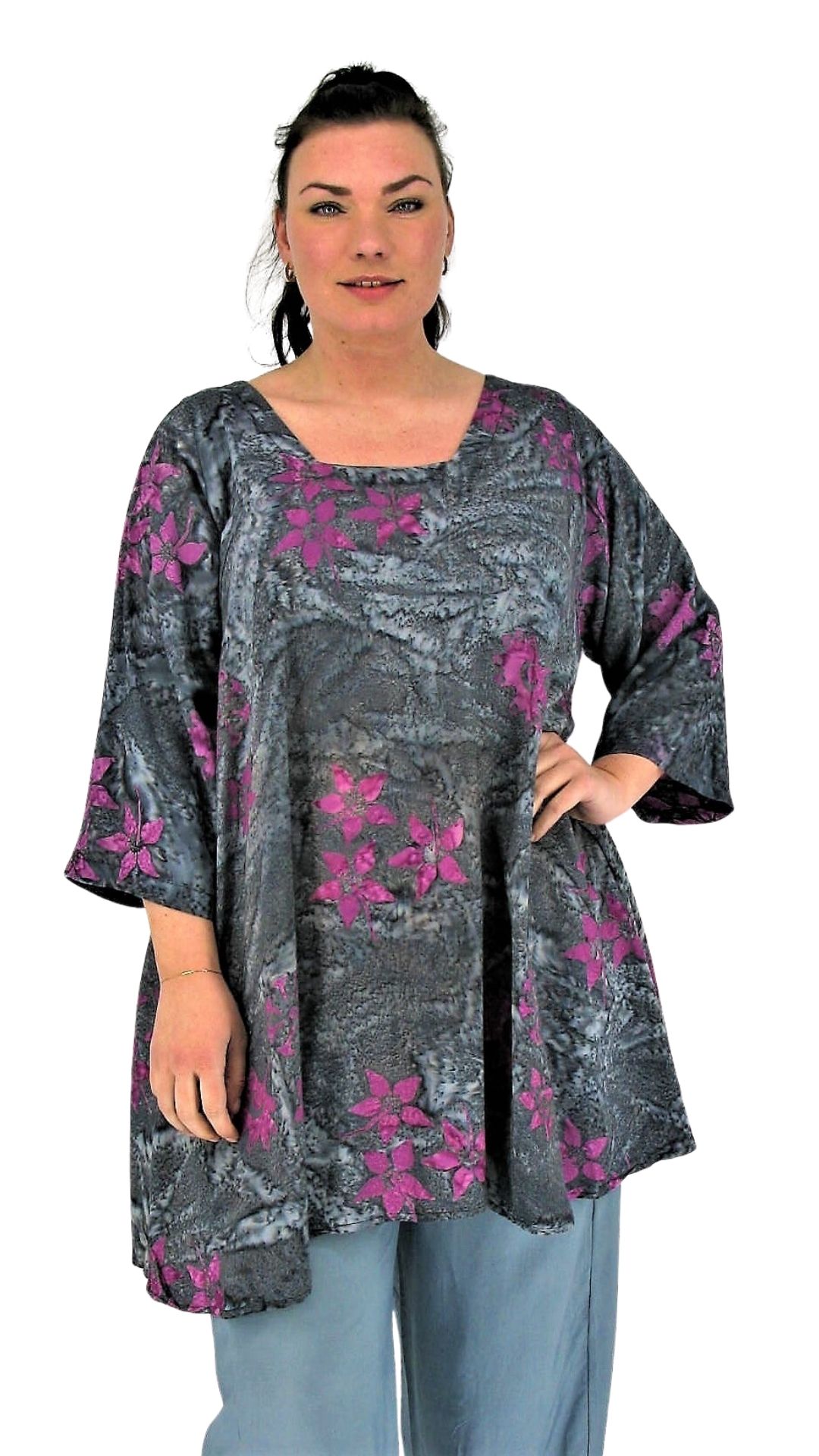 Mooie Alijn tuniek met een vierkante hals lijn model Claire van LUNA SERENA. De tuniek is gemaakt in een hoogwaardige viscose batik. Dit is een big size model, valt zeker tot en met maat 60. De mouwen vallen 7/8 en zijn wat wijder. De lengte van de tuniek valt op het boven de knie.