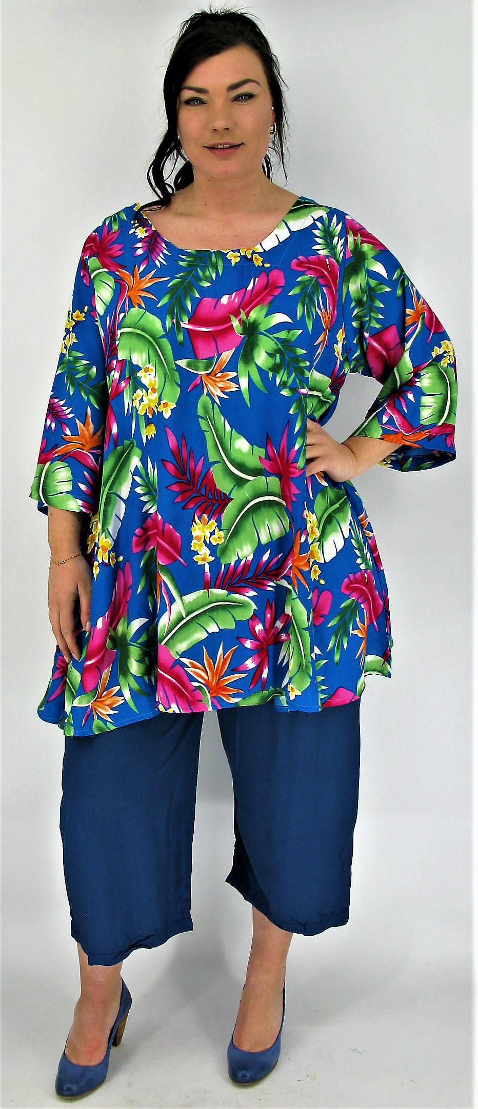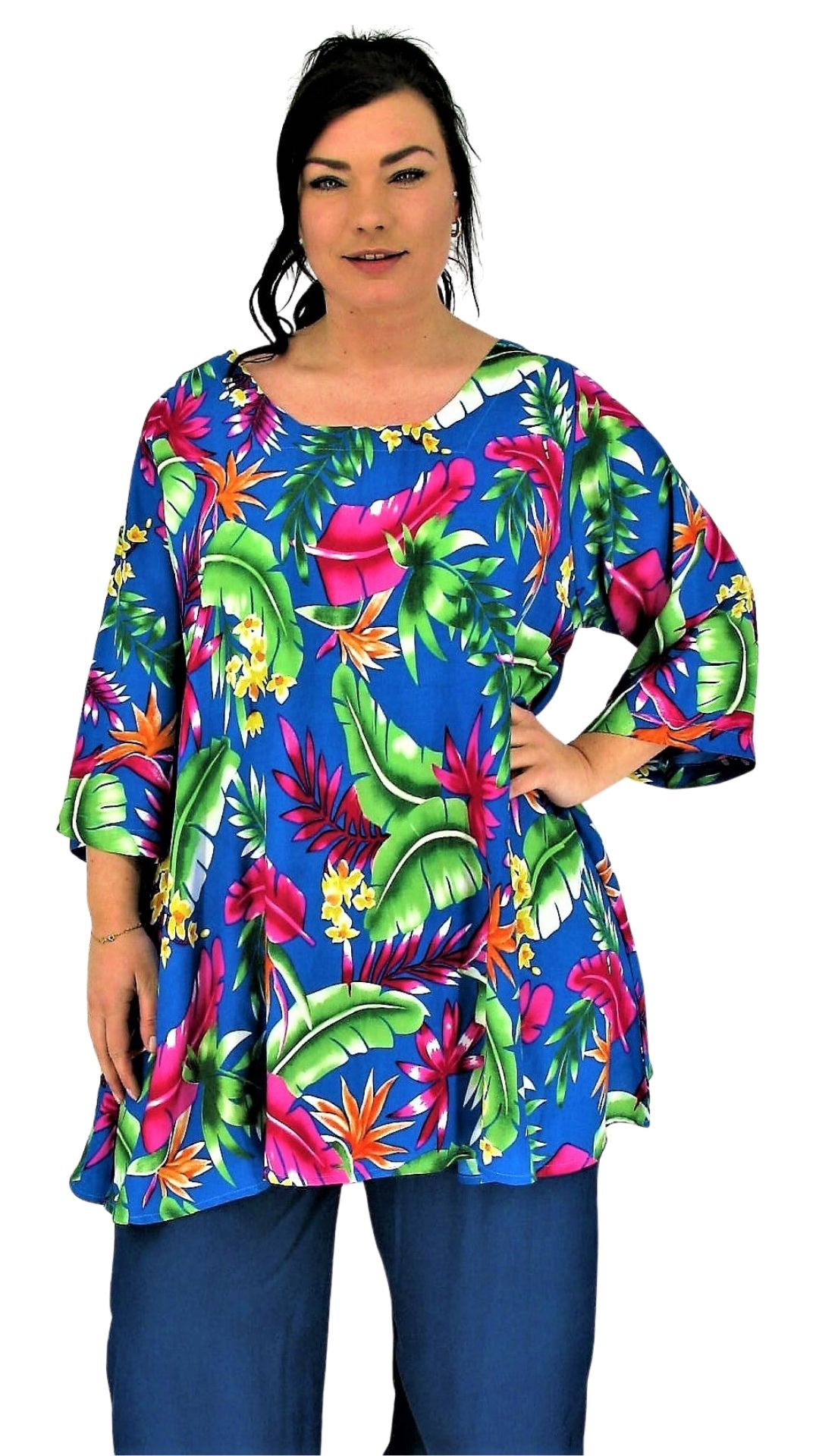 Mooie Alijn tuniek met een vierkante hals lijn model Claire van LUNA SERENA. De tuniek is gemaakt in een hoogwaardige viscose batik. Dit is een big size model, valt zeker tot en met maat 60. De mouwen vallen 7/8 en zijn wat wijder. De lengte van de tuniek valt op het boven de knie.