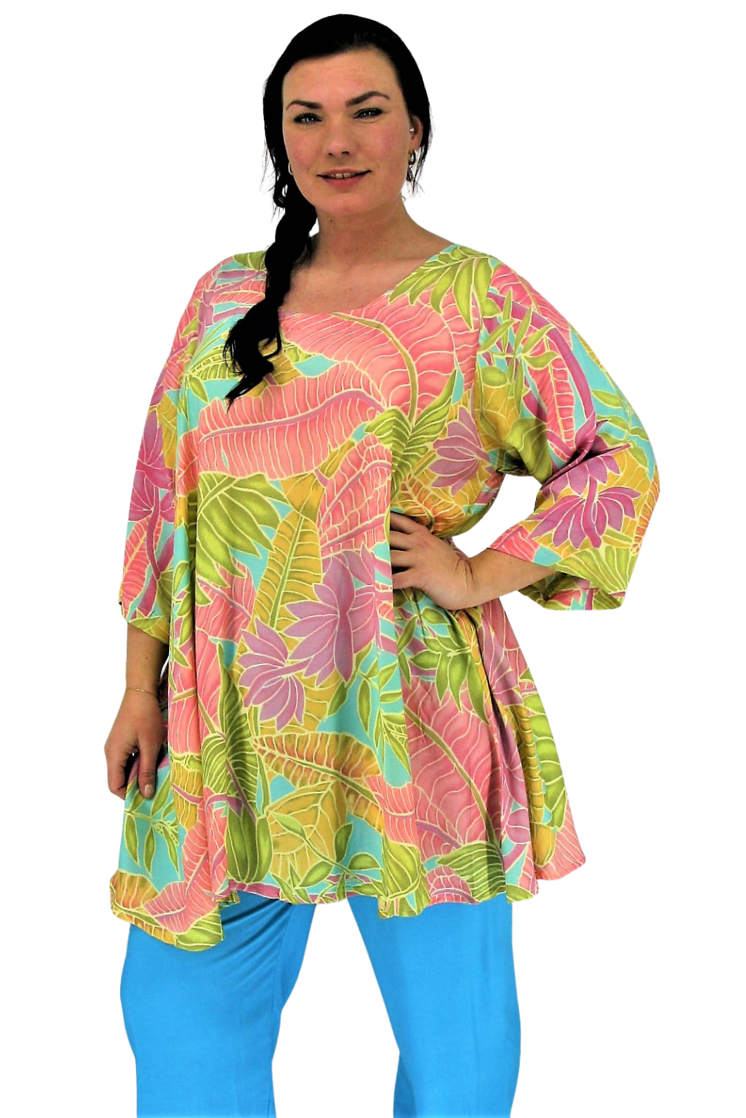 Mooie Alijn tuniek met een vierkante hals lijn model Claire van LUNA SERENA. De tuniek is gemaakt in een hoogwaardige viscose batik. Dit is een big size model, valt zeker tot en met maat 60. De mouwen vallen 7/8 en zijn wat wijder. De lengte van de tuniek valt op het boven de knie.
