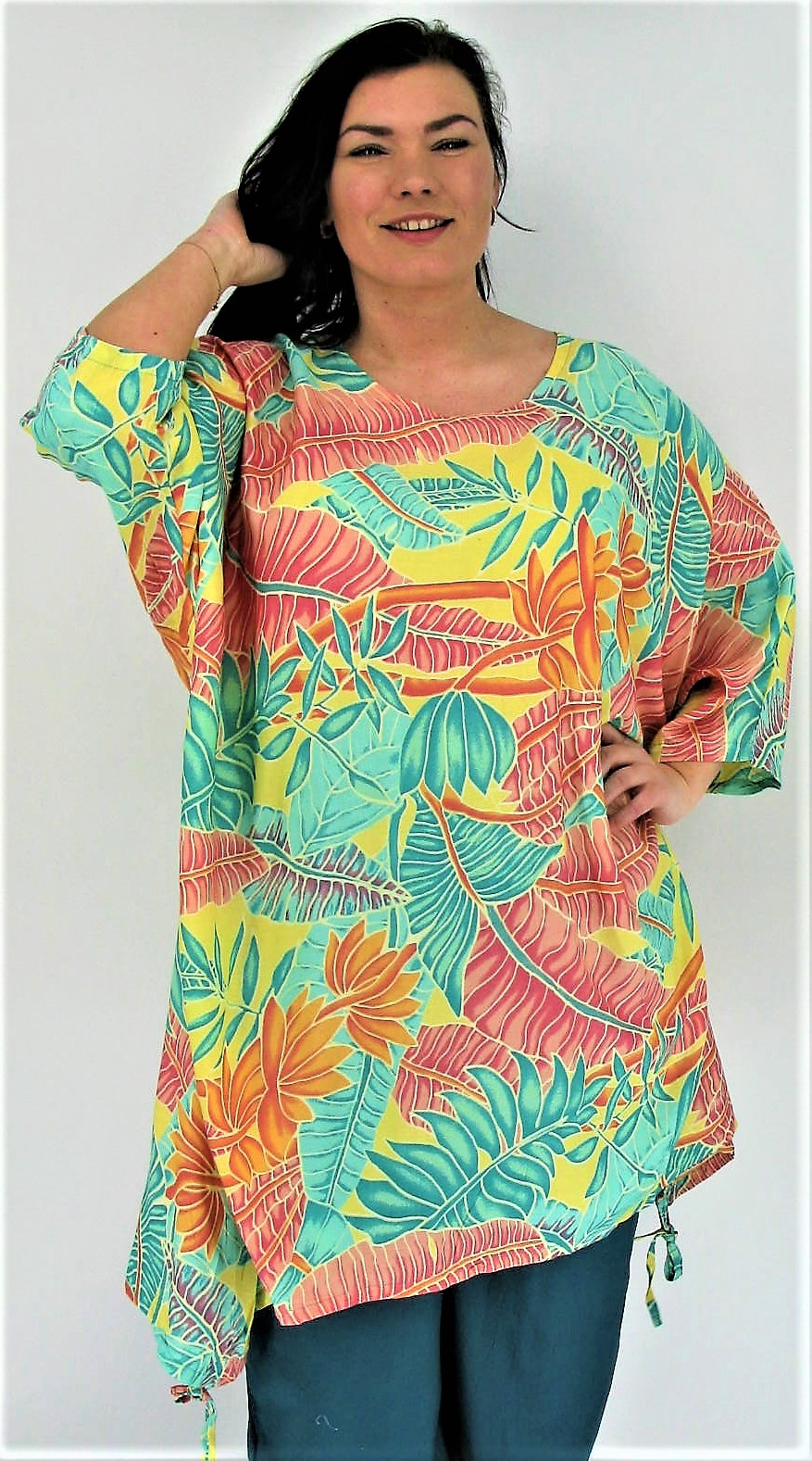 Aparte tuniek van Luna Serena model Ebony. Dit model loopt wijder uit naar de onderkant en heeft aan beide zijkant een ophaalstrik. De tuniek heeft een ronde hals en wijder vallende 7/8 mouwen. De lengte van de tuniek valt boven de knie en is 105cm lang. Dit model zit altijd in de collectie en loopt door maat 58-60. Hij is gemaakt in een batik viscose uit Indonesie.