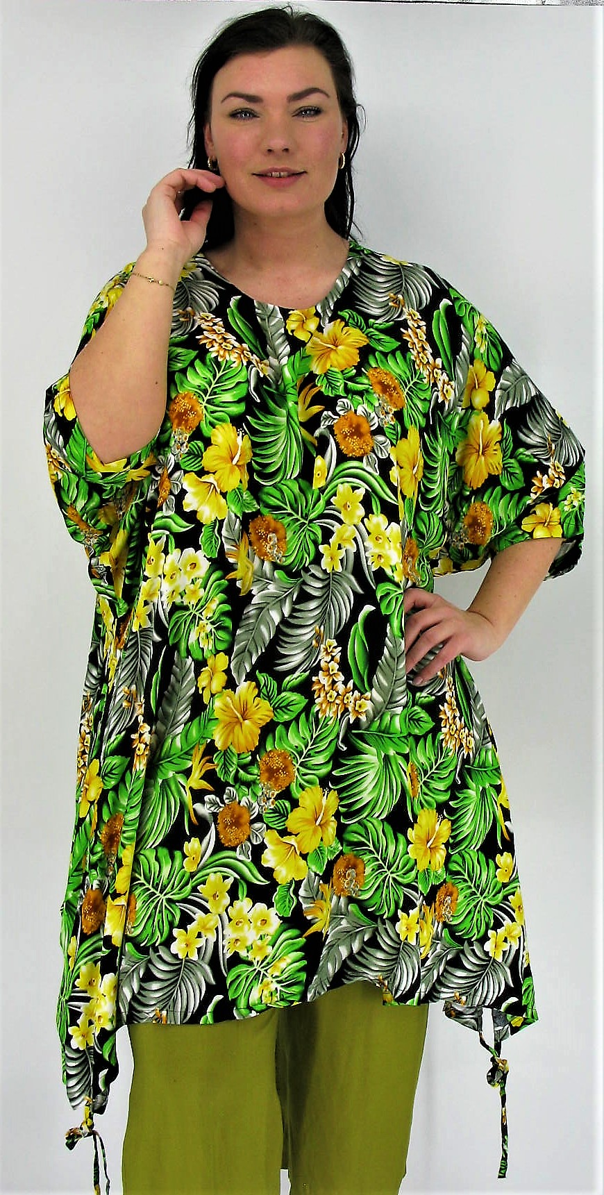 Aparte tuniek van Luna Serena model Ebony. Dit model loopt wijder uit naar de onderkant en heeft aan beide zijkant een ophaalstrik. De tuniek heeft een ronde hals en wijder vallende 7/8 mouwen. De lengte van de tuniek valt boven de knie en is 105cm lang. Dit model zit altijd in de collectie en loopt door maat 58-60. Hij is gemaakt in een batik viscose uit Indonesie.