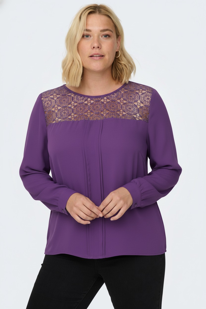 ONLY Carmakoma blouse CARALICE heeft een mooie kantpas bij de hals, deze schijnt door. Middenvoor zit een tweetal smalle plooitjes. Hij heeft lange mouwen met een manchet. In de achterhals zit een split met knoopje en lusje. De stof schijnt een beetje door, niet heel erg. De blouse heeft afgeronde panden en bij maat 46 een lengte van 67 cm voor en 72 cm achter. De mooiste blouses vindt je in de categorie grote maten blouses.