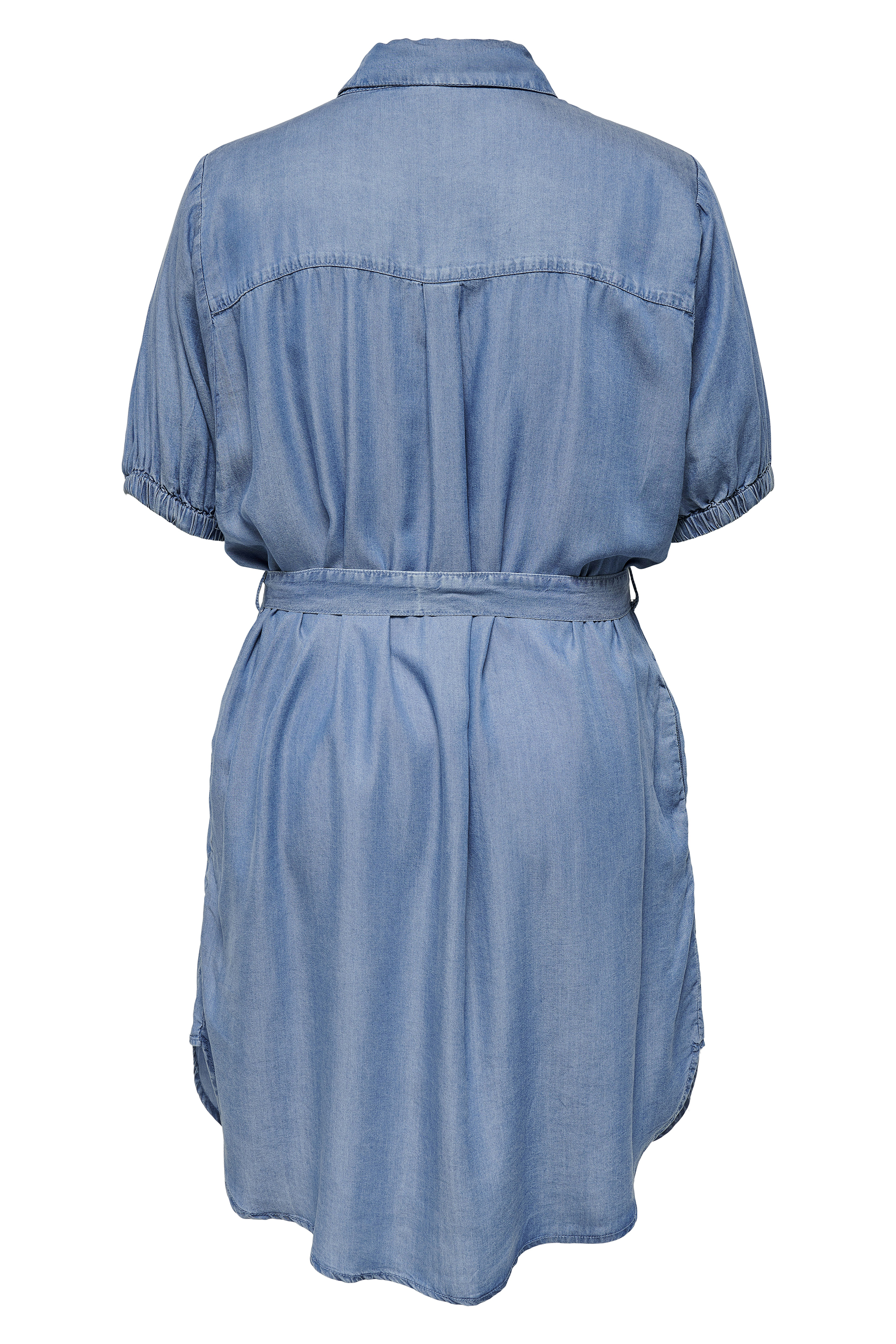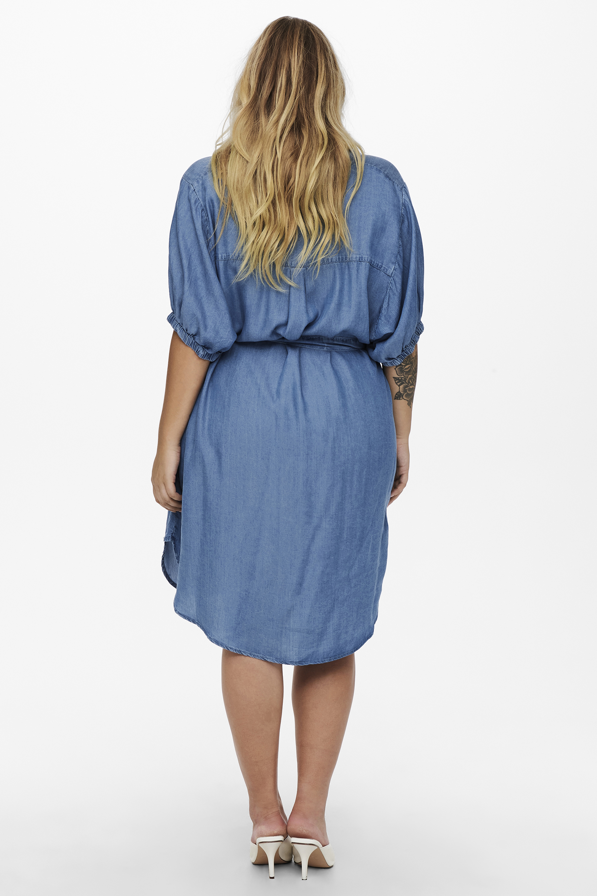 Wat een hip jurkje van ONLY Carmakoma. Hij is er in 2 kleuren een kaki groene en een lichte denim kleur. Het is een knielang model met afgeronde panden. Hij heeft leuke korte pofmouwen met een elastiekje in de zoom. Hij heeft een losse taille ceintuur en in de zijnaad zitten steekzakken en is geheel doorknoopbaar. Dit model is ook leuk om te combineren met een leatherlook legging.