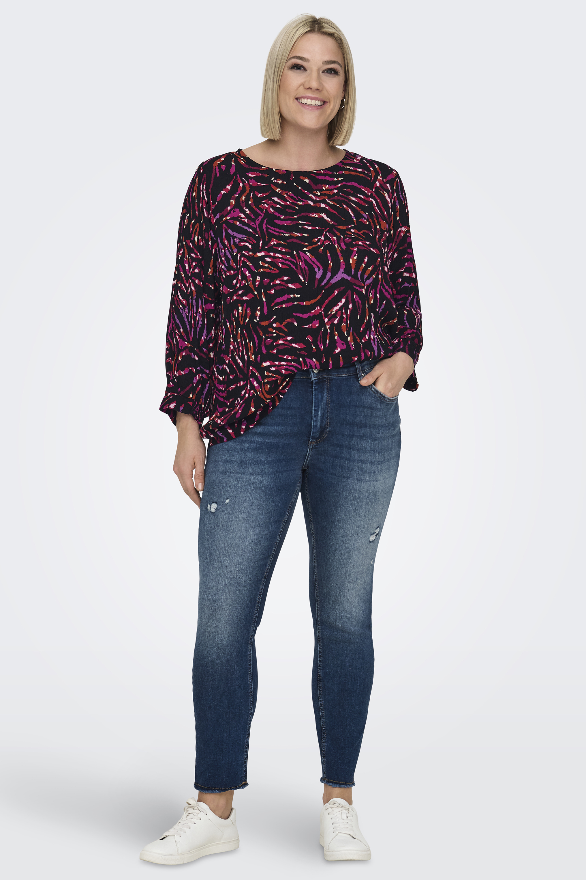 ONLY Carmakoma ECO blouse NANCI is gemaakt in een crincle stof met een mooie kleurige print. Hij heeft een ronde hals met in de achterhals een split, knoopje en lusje. De mouwen vallen driekwart en hebben smock elastiek. Helaas hebben wij de broek op de foto niet, maar natuurlijk wel een ander uitgebreid aanbod in jeans. Wil je nog meer leuke blouse zien, klik dan op de link blouses.