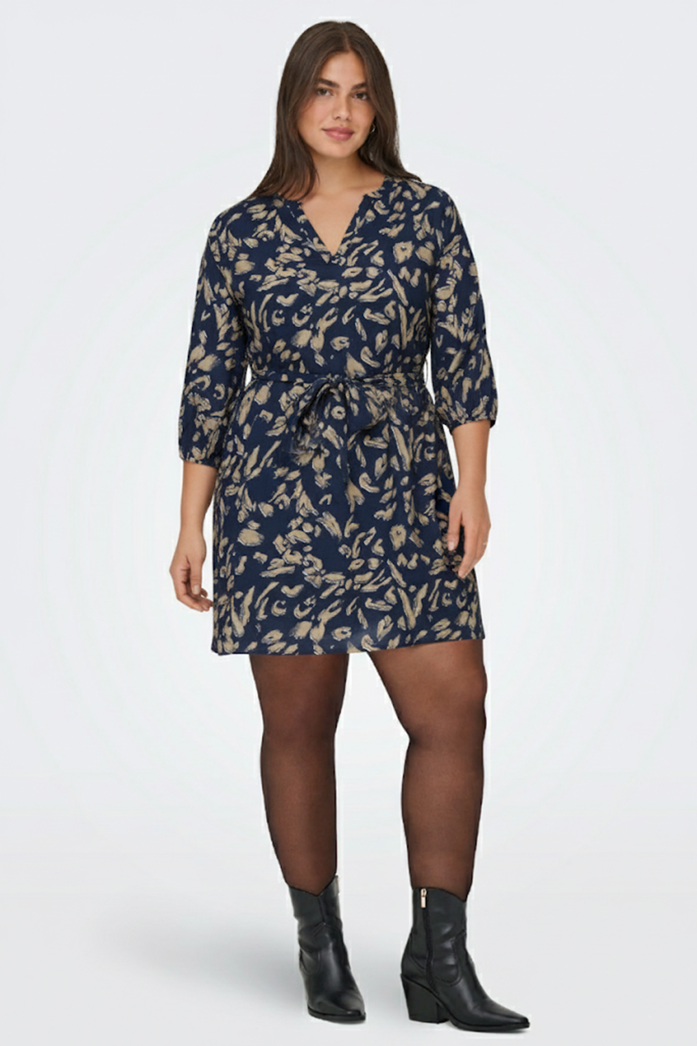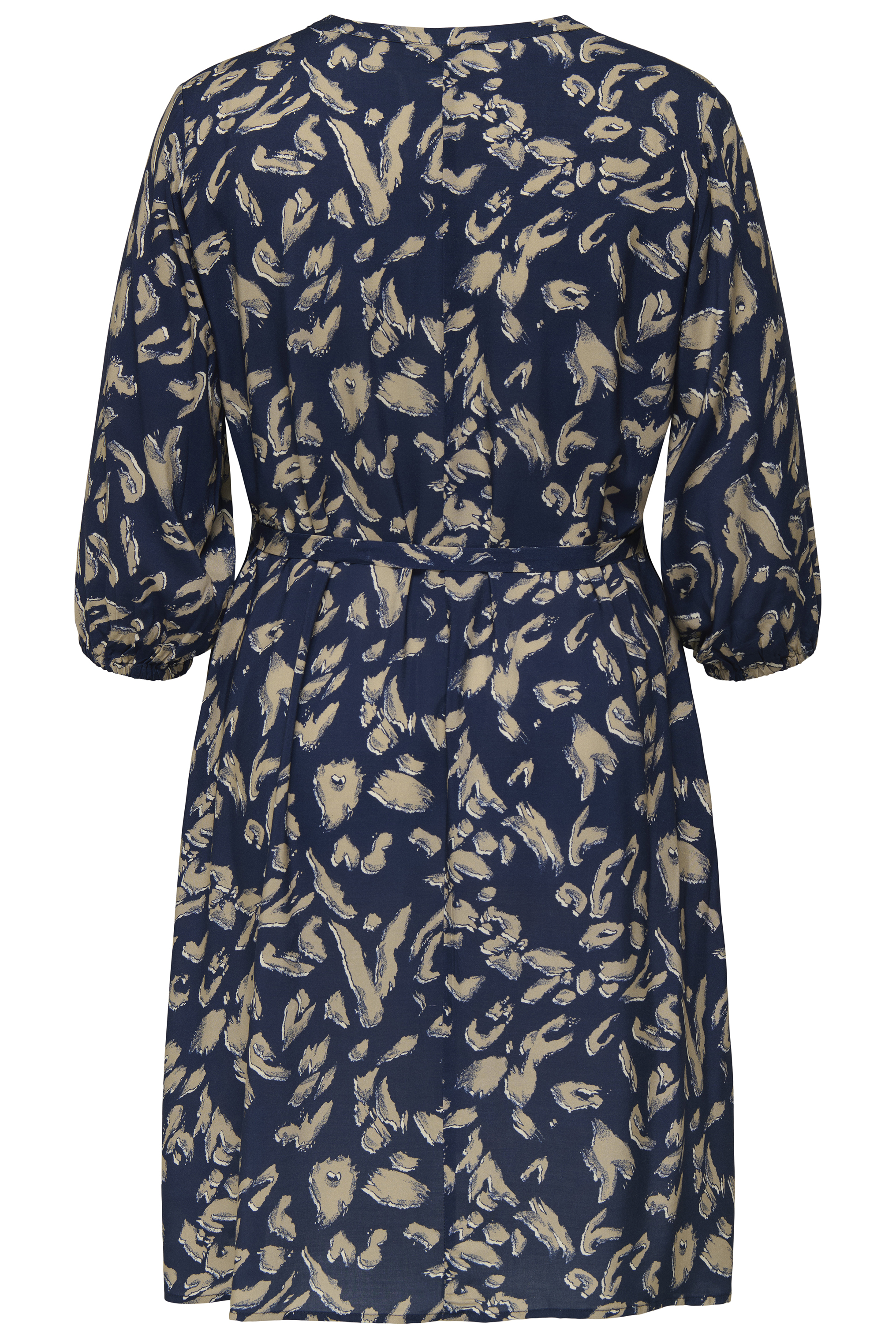 Het model heeft een rechte pasvorm, V-halslijn met split, en driekwart mouwen met elastische zoom. In de taille zit een afneembaar strikceintuur. De jurk valt boven de knie en is volledig bedrukt met een abstracte all-over print in beige op een donkerblauwe ondergrond.