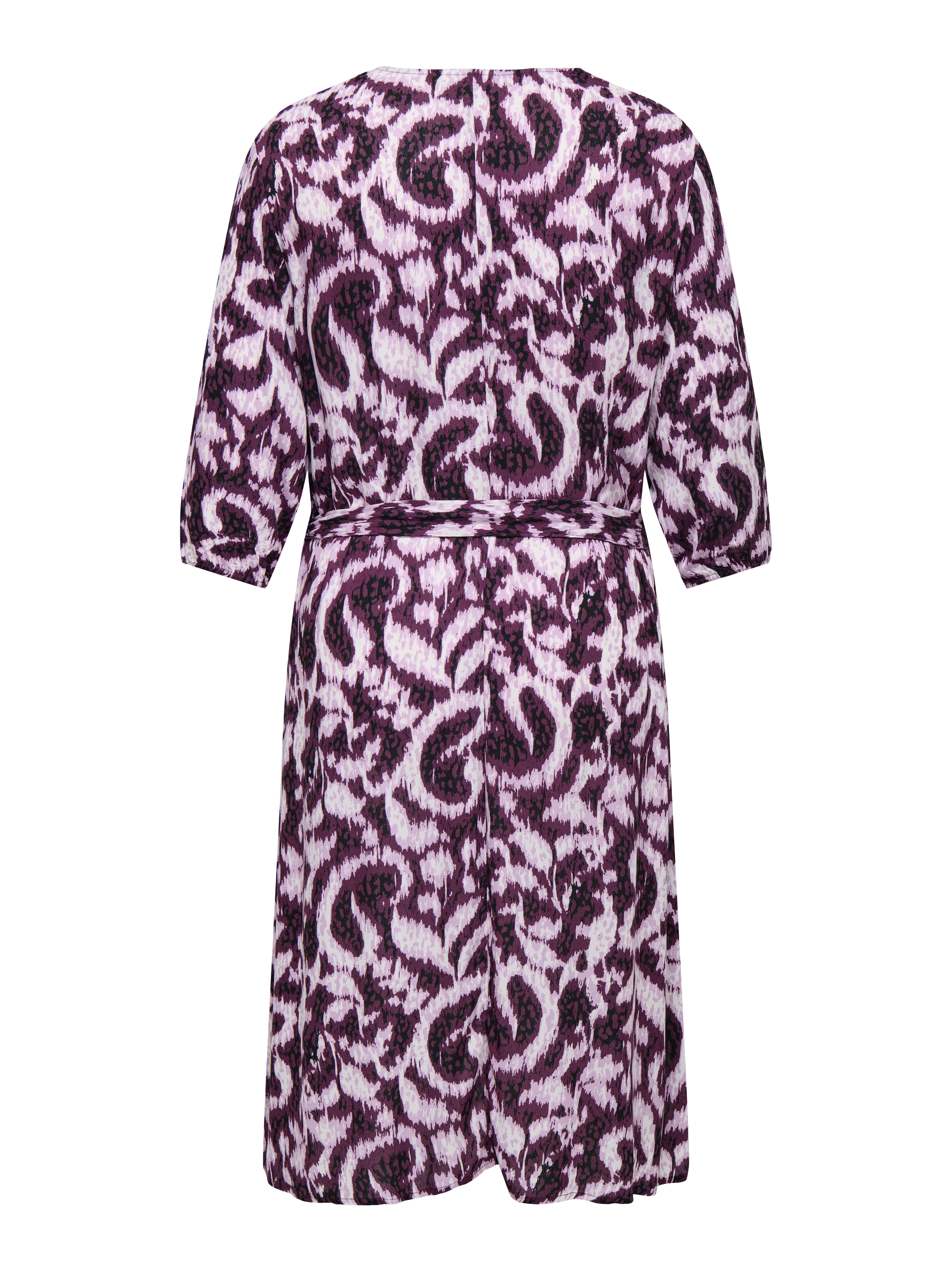De ONLY CARMAKOMA ECO midi-jurk is uitgevoerd in een niet-elastische geweven stof zonder stretch. Het model heeft een rechte, losvallende pasvorm met een knoopsluiting over de volledige lengte aan de voorzijde. De jurk is voorzien van een afneembare tailleband in dezelfde stof, bedoeld om de taille naar wens te accentueren. De driekwart mouwen zijn afgewerkt met een elastische band aan de uiteinden. De jurk is volledig bedrukt met een all-over dessin in roze en donkerpaars. De lengte valt tot over de knie.