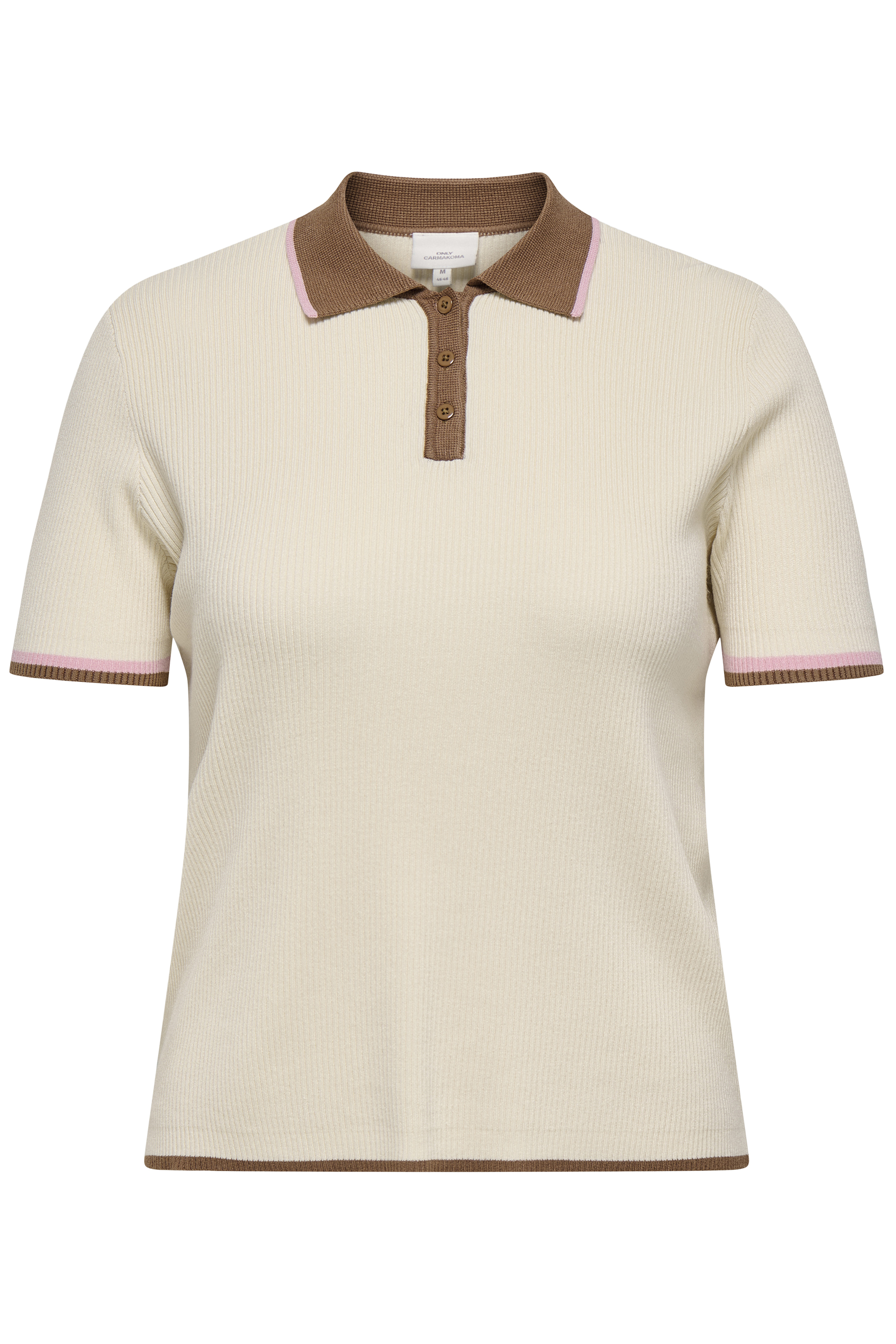 Wat een super gaaf poloshirt van ONLY Carmakoma. Hij is gemaakt in een rib breisel die goed mee rekt. Langs de korte mouw en kraag zit een camel/ roze streep. Langs de zoom alleen een camel kleur. Hij heeft een kort knooppad. Dit shirt heeft een losse pasvorm. Draag dit netjes bij een mooie broek of sportief bij een jeans.