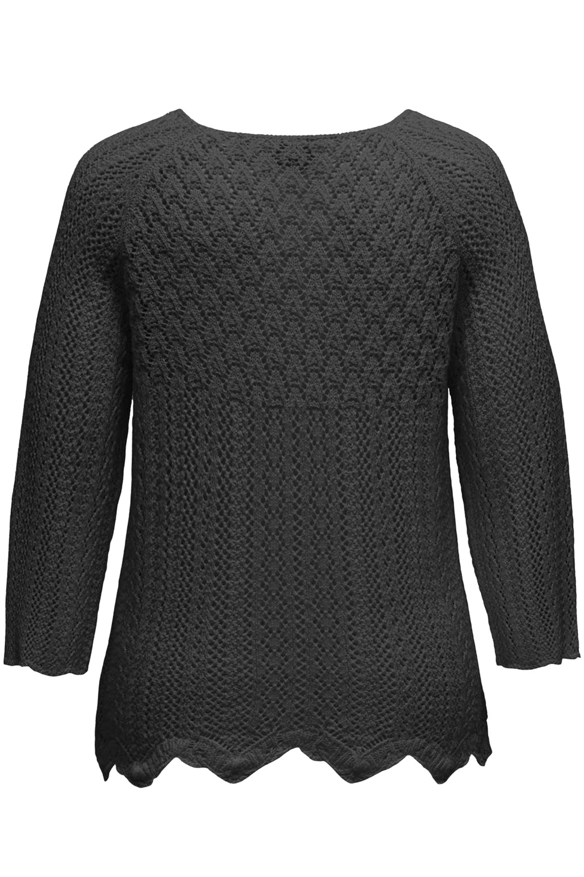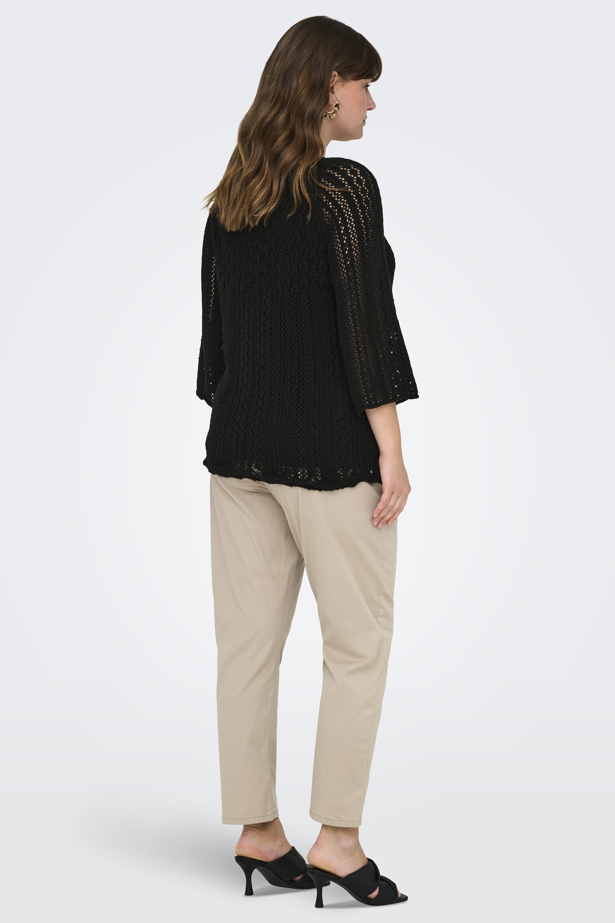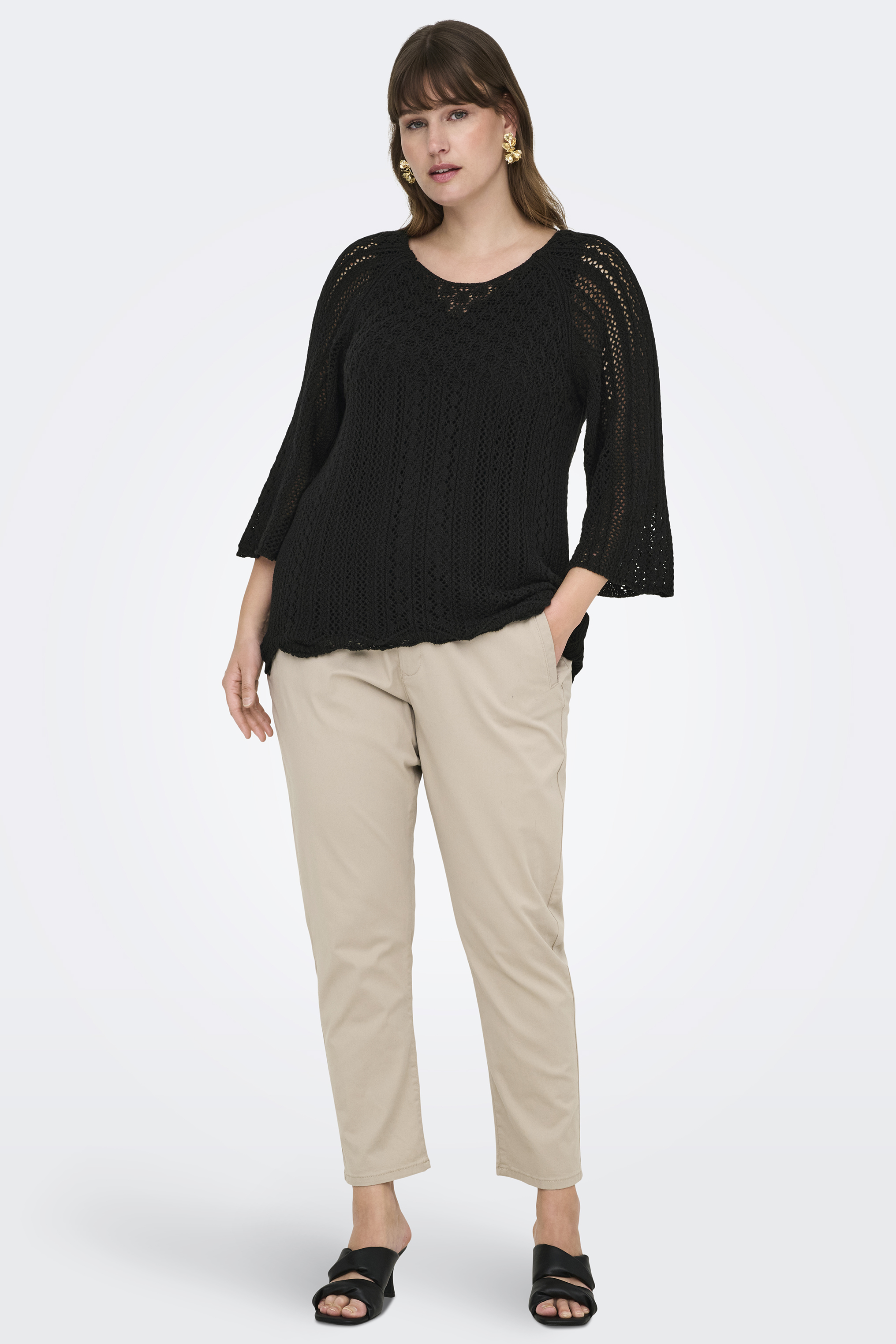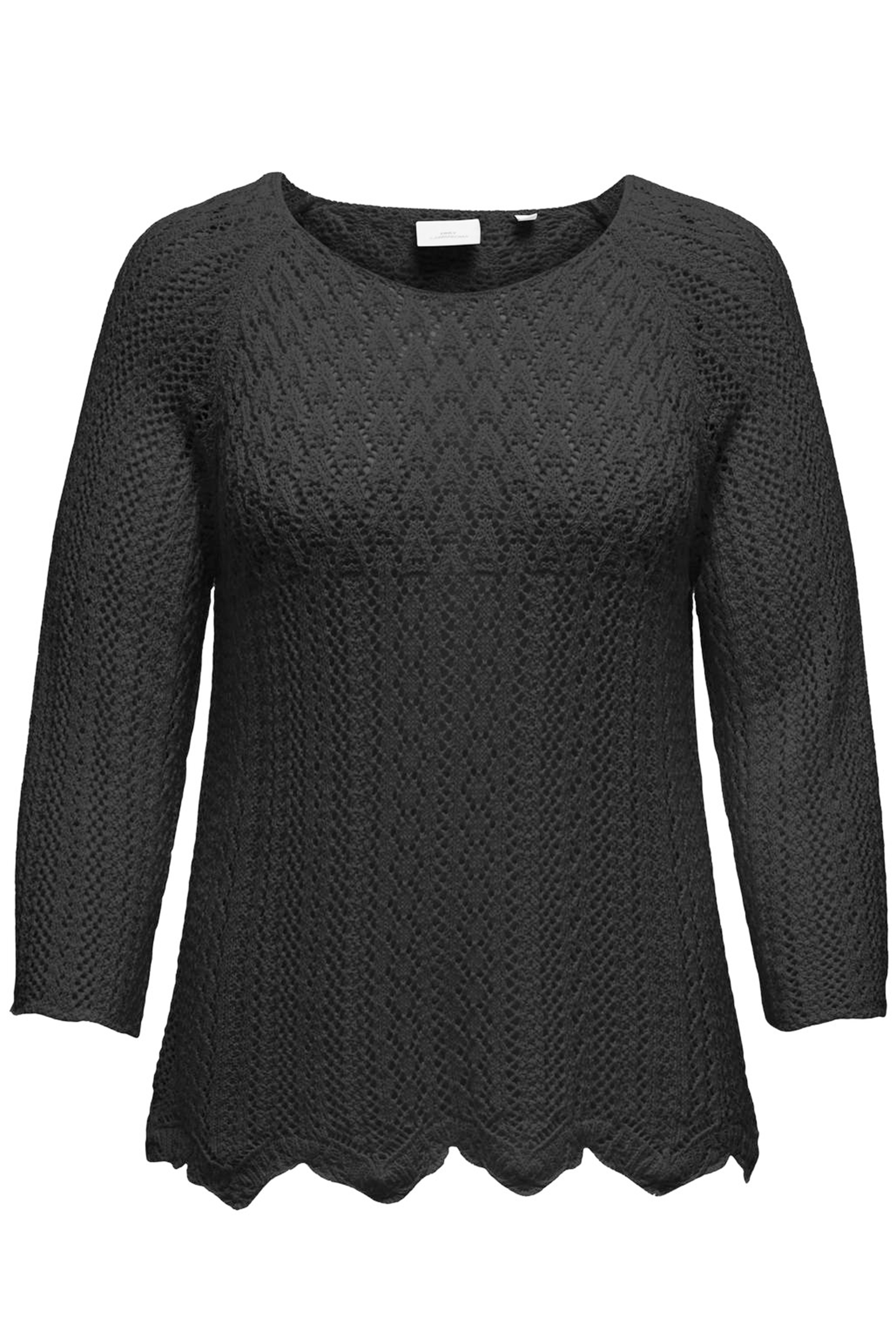 ONLY Carmakoma ECO trui CARNOLA heeft verschillende ajour breisel motiefjes. Hij heeft een ronde hals en een raglan mouw. De mouw valt wat wijder en is 7/8e lang. Aan de onderkant bij de zoom zit een golfrandje. Het model draagt de trui op een denim rok bijvoorbeeld de 15324767, erg leuk. Of draag hem bij een vlotte jeans.